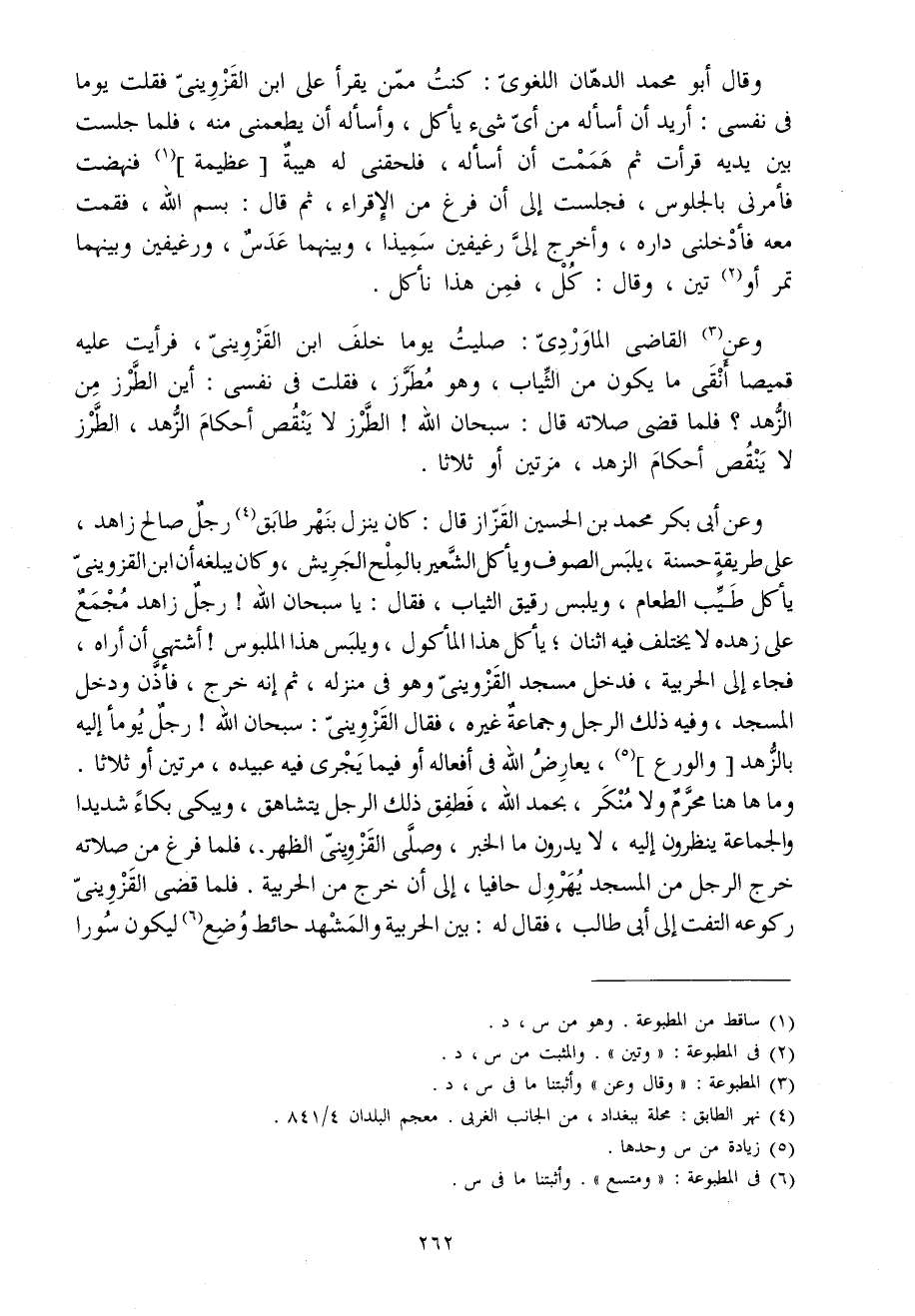 وَعَن أبي بكر مُحَمَّد بن الْحُسَيْن الْقَزاز قَالَ كَانَ ينزل بنهر طابق رجل صَالح زاهد على طَريقَة حَسَنَة يلبس الصُّوف وَيَأْكُل الشّعير بالملح الجريش وَكَانَ يبلغهُ أَن ابْن الْقزْوِينِي يَأْكُل طيب الطَّعَام ويلبس رَقِيق الثِّيَاب فَقَالَ يَا سُبْحَانَ الله رجل زاهد مجمع على زهده لَا يخْتَلف فِيهِ اثْنَان يَأْكُل هَذَا الْمَأْكُول ويلبس هَذَا الملبوس أشتهى أَن أرَاهُ فجَاء إِلَى الحربية فَدخل مَسْجِد الْقزْوِينِي وَهُوَ فِي منزله ثمَّ إِنَّه خرج فَأذن وَدخل الْمَسْجِد وَفِيه ذَلِك الرجل وَجَمَاعَة غَيره فَقَالَ الْقزْوِينِي سُبْحَانَ الله رجل يومأ إِلَيْهِ بالزهد والورع يُعَارض الله فِي أَفعاله أَو فِيمَا يجْرِي فِيهِ عُبَيْدَة مرَّتَيْنِ أَو ثَلَاثًا
