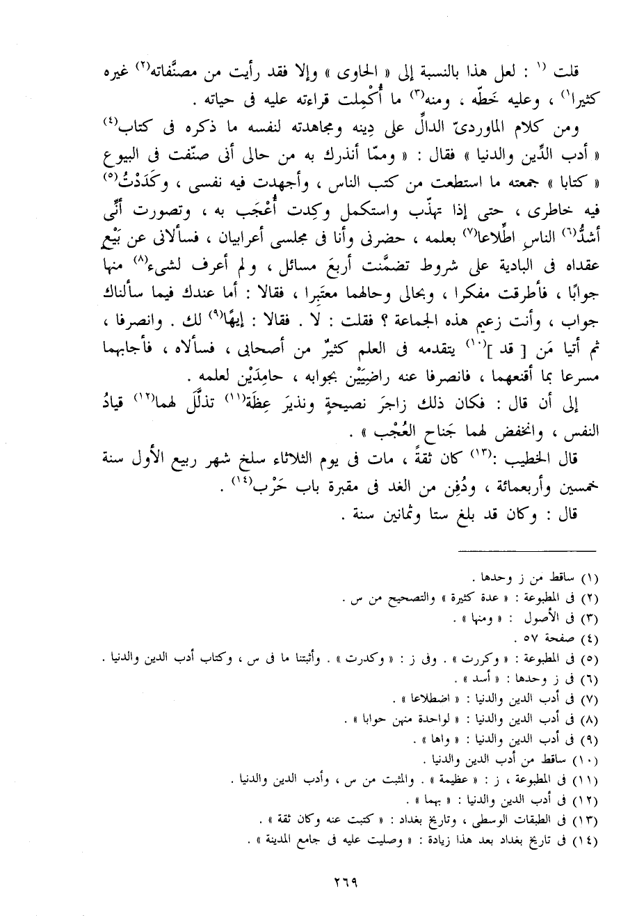 وَمن كَلَام الْمَاوَرْدِيّ الدَّال على دينه ومجاهدته لنَفسِهِ مَا ذكره فِي كتاب أدب الدّين وَالدُّنْيَا فَقَالَ وَمِمَّا أنذرك بِهِ من حَالي أَنِّي صنفت فِي الْبيُوع كتابا جمعته مَا اسْتَطَعْت من كتب النَّاس وأجهدت فِيهِ نَفسِي وكددت فِيهِ خاطري حَتَّى إِذا تهذب واستكمل وكدت أعجب بِهِ وتصورت أَنِّي أَشد النَّاس اطلاعا بِعِلْمِهِ حضرني وَأَنا فِي مجلسي أَعْرَابِيَّانِ فسألاني عَن بيع عقداه فِي الْبَادِيَة على شُرُوط تَضَمَّنت أَربع مسَائِل وَلم أعرف لشَيْء مِنْهَا جَوَابا فأطرقت مفكرا وبحالي وحالهما مُعْتَبرا فَقَالَا أما عنْدك فِيمَا سألناك جَوَاب وَأَنت زعيم هَذِه الْجَمَاعَة فَقلت لَا فَقَالَا إيها لَك