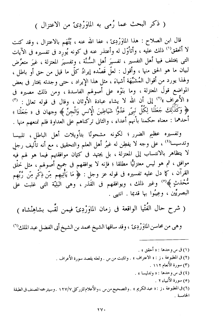 قَالَ ابْن الصّلاح هَذَا الْمَاوَرْدِيّ عَفا الله عَنهُ يتهم بالاعتزال وَقد كنت لَا أتحقق ذَلِك عَلَيْهِ وأتأول لَهُ وأعتذر عَنهُ فِي كَونه يُورد فِي تَفْسِيره فِي الْآيَات الَّتِي يخْتَلف فِيهَا أهل التَّفْسِير تَفْسِير أهل السّنة وَتَفْسِير الْمُعْتَزلَة غير متعرض لبَيَان مَا هُوَ الْحق مِنْهَا وَأَقُول لَعَلَّ قَصده إِيرَاد كل مَا قيل من حق أَو بَاطِل وَلِهَذَا يُورد من أَقْوَال المشبهة أَشْيَاء مثل هَذَا الْإِيرَاد حَتَّى وجدته يخْتَار فِي بعض الْمَوَاضِع قَول الْمُعْتَزلَة وَمَا بنوه على أصولهم الْفَاسِدَة وَمن ذَلِك مصيره فِي الْأَعْرَاف إِلَى أَن الله لَا يَشَاء عبَادَة الْأَوْثَان وَقَالَ فِي قَوْله تَعَالَى {وَكَذَلِكَ جعلنَا لكل نَبِي عدوا شياطين الْإِنْس وَالْجِنّ} وَجْهَان فِي جعلنَا أَحدهمَا مَعْنَاهُ حكمنَا بِأَنَّهُم أَعدَاء وَالثَّانِي تركناهم على الْعَدَاوَة فَلم نمنعهم مِنْهَا