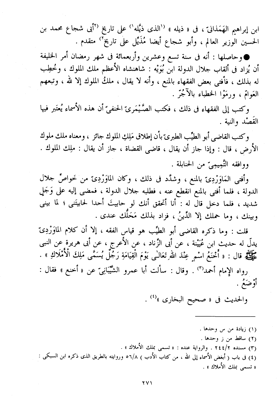 وحاصلها أَنه فِي سنة تسع وَعشْرين وَأَرْبَعمِائَة فِي شهر رَمَضَان أَمر الْخَلِيفَة أَن يُزَاد فِي ألقاب جلال الدولة ابْن بويه شاهنشاه الْأَعْظَم ملك الْمُلُوك وخطب لَهُ بذلك فَأفْتى بعض الْفُقَهَاء بِالْمَنْعِ وَأَنه لَا يُقَال ملك الْمُلُوك إِلَّا لله وتبعهم الْعَوام ورموا الخطباء بالآجر