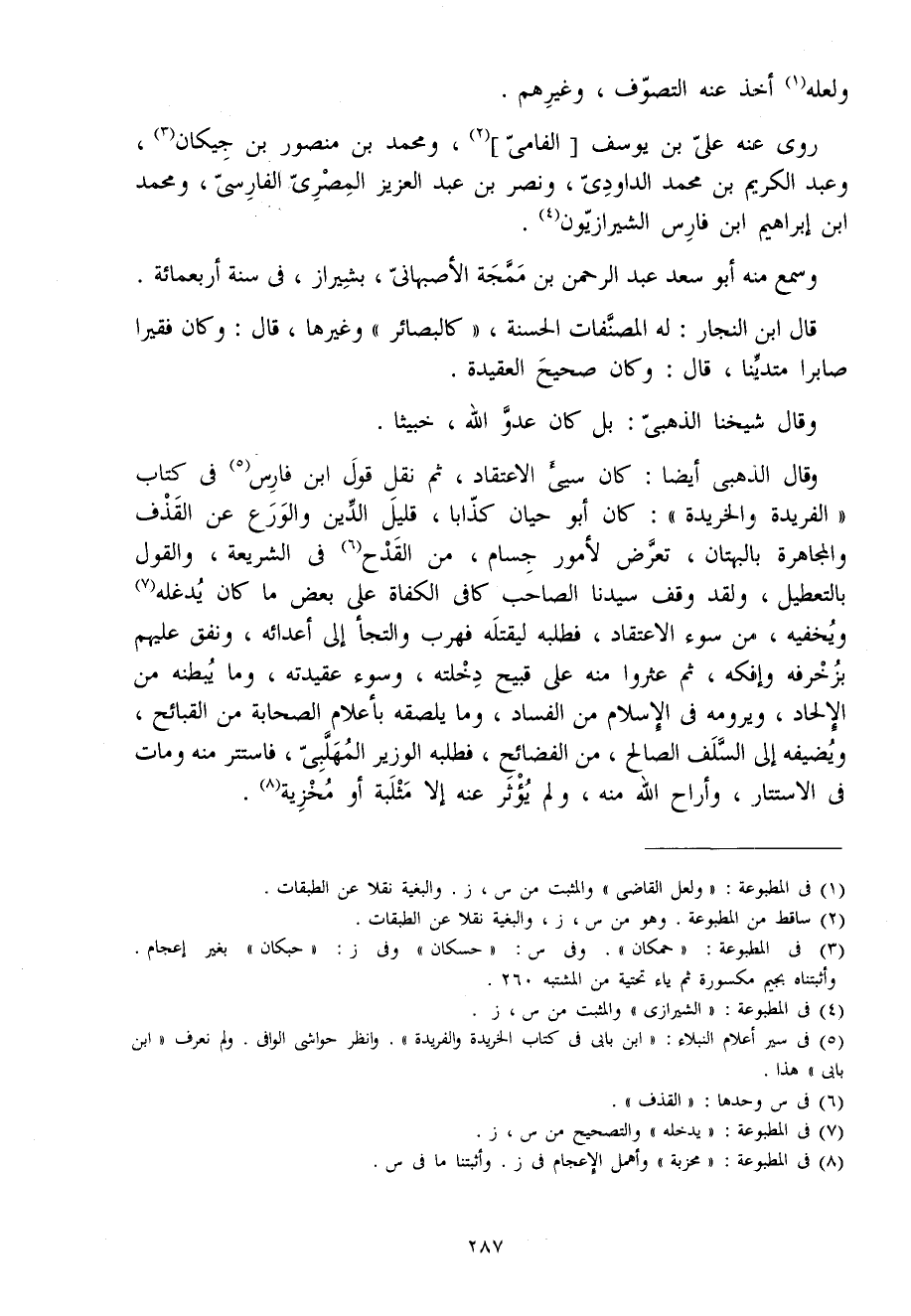 وَقَالَ الذَّهَبِيّ أَيْضا كَانَ سيء الِاعْتِقَاد ثمَّ نقل قَول ابْن فَارس فِي كتاب الفريدة والخريدة كَانَ أَبُو حَيَّان كذابا قَلِيل الدّين والورع عَن الْقَذْف والمجاهرة بالبهتان تعرض لأمور جسام من الْقدح فِي الشَّرِيعَة وَالْقَوْل بالتعطيل وَلَقَد وقف سيدنَا الصاحب كَافِي الكفاة على بعض مَا كَانَ يدغله ويخفيه من سوء الِاعْتِقَاد فَطَلَبه ليَقْتُلهُ فهرب والتجأ إِلَى أعدائه ونفق عَلَيْهِم بزخرفه وإفكه ثمَّ عثروا مِنْهُ على قَبِيح دَخلته وَسُوء عقيدته وَمَا يبطنه من الْإِلْحَاد ويرومه فِي الْإِسْلَام من الْفساد وَمَا يلصقه بأعلام الصَّحَابَة من القبائح ويضيفه إِلَى السّلف الصَّالح من الفضائح فَطَلَبه الْوَزير المهلبي فاستتر مِنْهُ وَمَات فِي الاستتار وأراح الله مِنْهُ وَلم يُؤثر عَنهُ إِلَّا مثلبة أَو مخزية