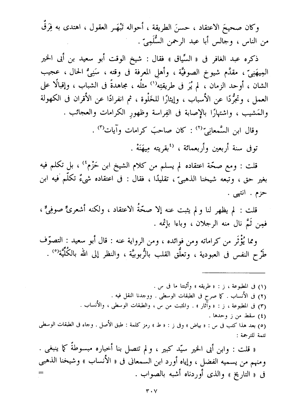 ذكره عبد الغافر فِي السِّيَاق فَقَالَ شيخ الْوَقْت أَبُو سعيد بن أبي الْخَيْر الميهني مقدم شُيُوخ الصُّوفِيَّة وَأهل الْمعرفَة فِي وقته سني الْحَال عَجِيب الشان أوحد الزَّمَان لم ير فِي طَرِيقَته مثله مجاهدة فِي الشَّبَاب وإقبالا على الْعَمَل وتجردا عَن الْأَسْبَاب وإيثارا للخلوة ثمَّ انفرادا عَن الأقران فِي الكهولة والمشيب واشتهارا بالإصابة فِي الفراسة وَظُهُور الكرامات والعجائب