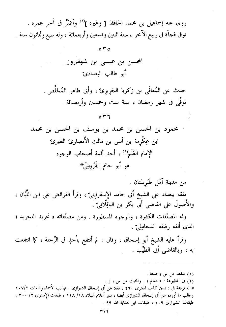 536 - مَحْمُود بن الْحسن بن مُحَمَّد بن يُوسُف بن الْحسن بن مُحَمَّد ابْن عِكْرِمَة بن أنس بن مَالك الْأنْصَارِيّ الطَّبَرِيّ الإِمَام الْعلم أحد أَئِمَّة أَصْحَاب الْوُجُوه هُوَ أَبُو حَاتِم الْقزْوِينِي