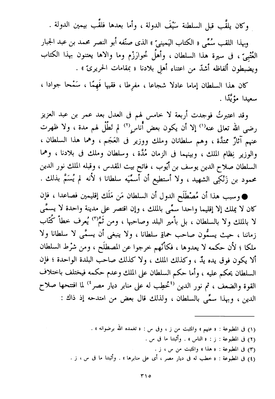 وَسبب هَذَا أَن مصطلح الدول أَن السُّلْطَان من ملك إقليمين فَصَاعِدا فَإِن كَانَ لَا يملك إِلَّا إقليما وَاحِدًا سمي بِالْملكِ وَإِن اقْتصر على مَدِينَة وَاحِدَة لَا يُسمى لَا بِالْملكِ وَلَا بالسلطان بل بأمير الْبَلَد وصاحبها وَمن ثمَّ يعرف خطأ كتاب زَمَاننَا حَيْثُ يسمون صَاحب حماة سُلْطَانا وَلَا يَنْبَغِي أَن يُسمى لَا سُلْطَانا وَلَا ملكا لِأَن حكمه لَا يعدوها فكأنهم خَرجُوا عَن المصطلح وَمن شَرط السُّلْطَان أَلا يكون فَوق يَده يَد وَكَذَلِكَ الْملك وَلَا كَذَلِك صَاحب الْبَلدة الْوَاحِدَة فَإِن السُّلْطَان يحكم عَلَيْهِ وَأما حكم السُّلْطَان على الْملك وَعدم حكمه فيختلف باخْتلَاف الْقُوَّة والضعف ثمَّ نور الدّين خطب لَهُ على مَنَابِر ديار مصر لما افتتحها صَلَاح الدّين وَبِهَذَا سمي بالسلطان وَلذَلِك قَالَ بعض من امتدحه إِذْ ذَاك