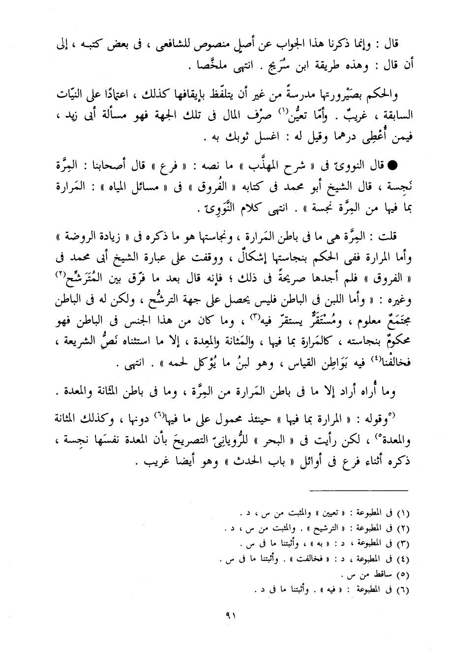 قَالَ النَّوَوِيّ فِي شرح الْمُهَذّب مَا نَصه فرع قَالَ أَصْحَابنَا الْمرة نَجِسَة قَالَ الشَّيْخ أَبُو مُحَمَّد فِي كِتَابه الفروق فِي مسَائِل الْمِيَاه المرارة بِمَا فِيهَا من الْمرة نَجِسَة