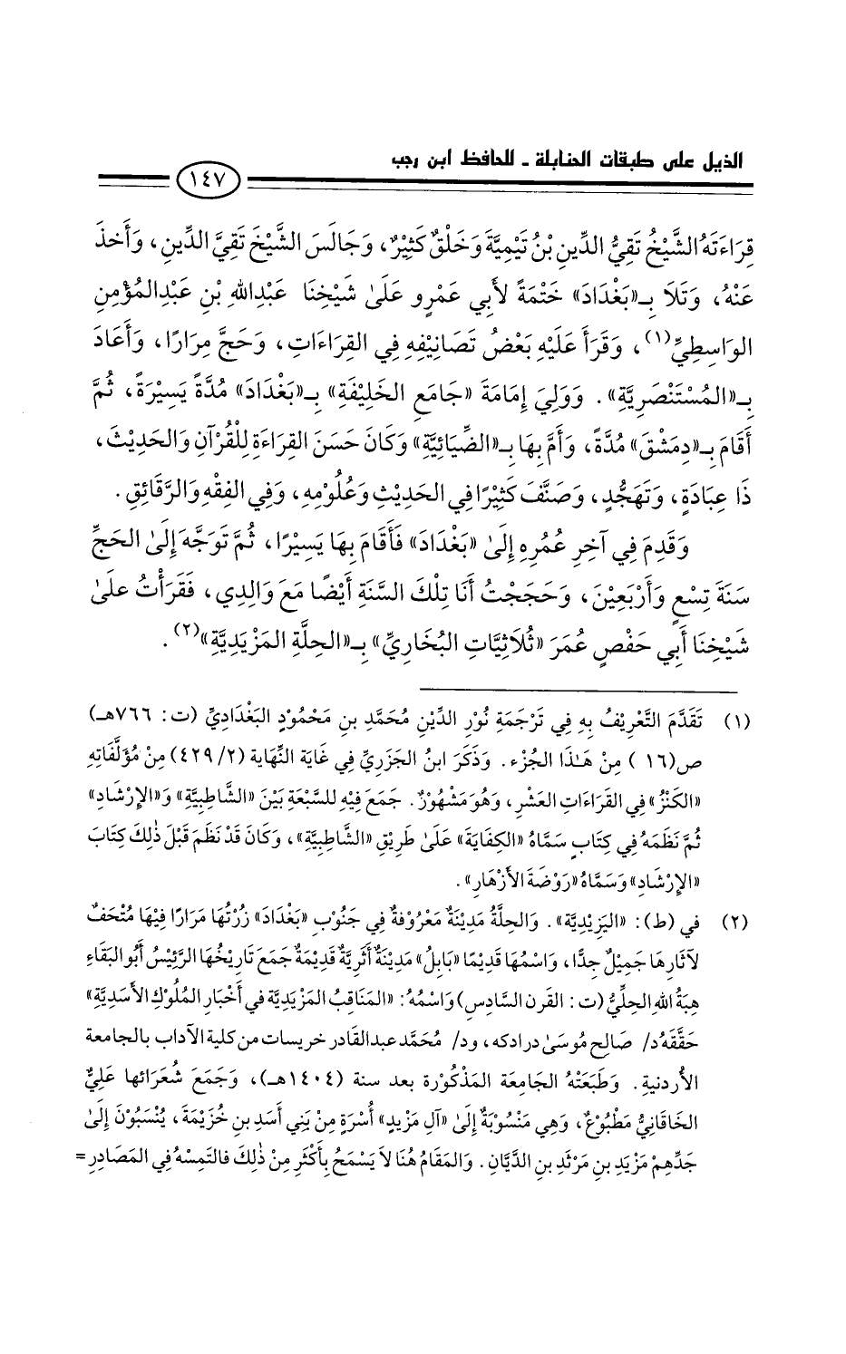قراءته الشيخ تقي الدين ابْن تيمية وخلق كثير، وجالس الشيخ تقي الدين وأخذ عَنْهُ، وتلا ببغداد ختمة لأبي عُمَر، وعلى شيخنا عَبْد الَلَّه بْن عَبْد المؤمن الواسطي، وقرأ عَلَيْهِ بَعْض تصانيفه فِي القراءات. وحج مرارا، وأعاد بالمستنصرية.