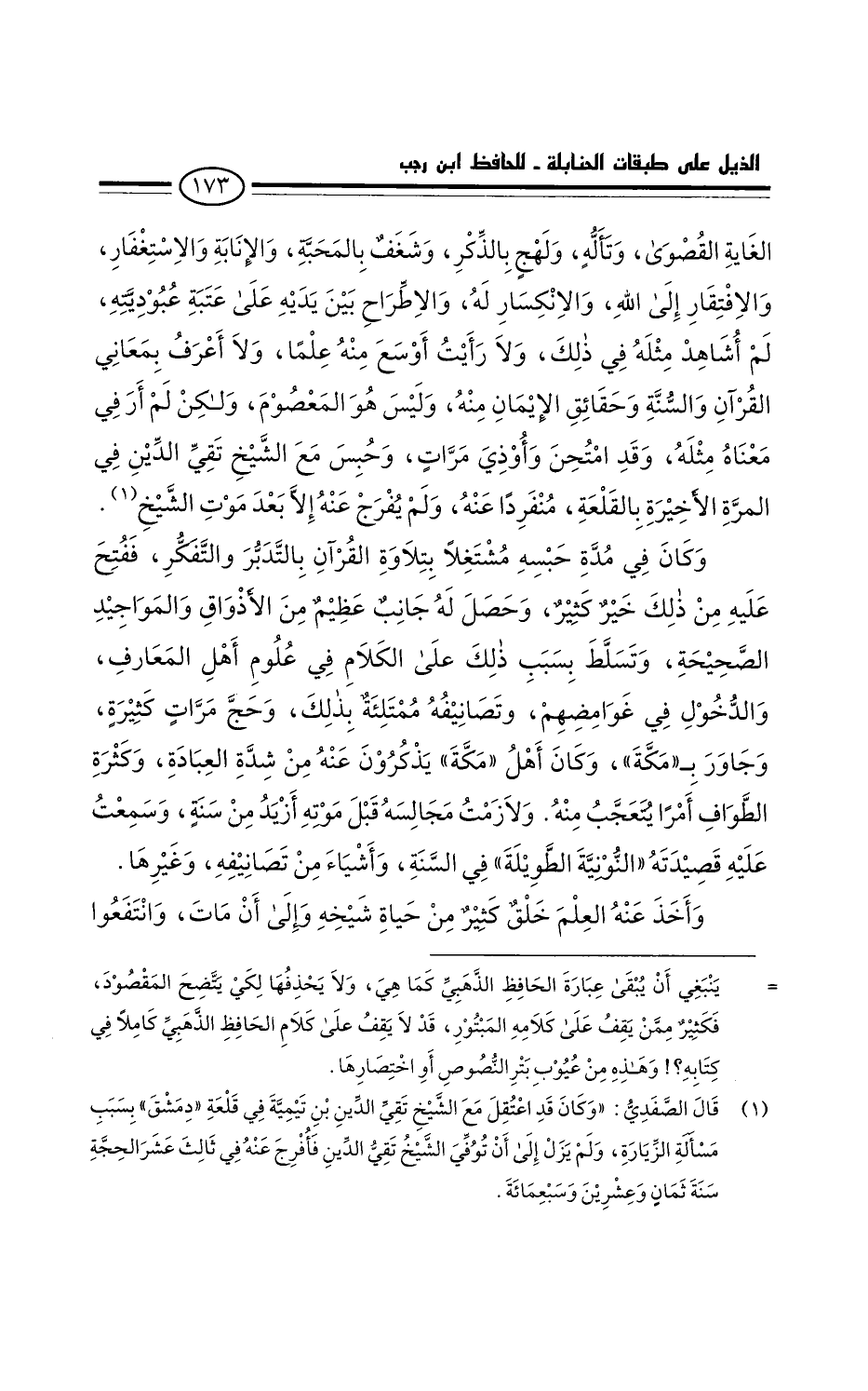 وَكَانَ فِي مدة حبسه مشتغلا بتلاوة القراَن بالتدبر والتفكر، ففتح عَلَيْهِ من ذَلِكَ خير كثير، وحصل لَهُ جانب عظيم من الأذواق والمواجيد الصحيحة، وتسلط بسبب ذَلِكَ عَلَى الْكَلام فِي علوم أهل المعارف، والدخول فِي غوامضهم، وتصانيفه ممتلئة بِذَلِكَ، وحج مرات كثيرة، وجاور بمكة. وَكَانَ أهل مَكَّة يذكرون عَنْهُ من شدة العبادة، وكثرة الطواف أمرا يتعجب منه. ولازمت مجالسه قبل موته أزيد من سنة، وسمعت عَلَيْهِ " قصيدته النونية الطويلة " فِي السنة، وأشياء من تصانيفه، وغيرها.