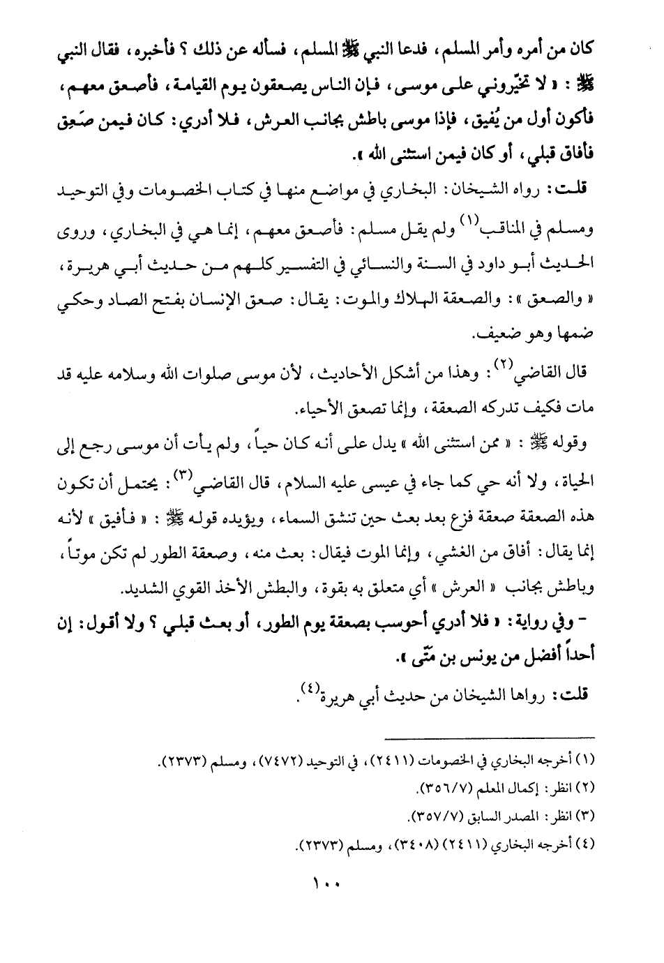 كان من أمره وأمر المسلم، فدعا النبي - صلى الله عليه وسلم - المسلم، فسأله عن ذلك؟ فأخبره، فقال النبي - صلى الله عليه وسلم -: "لا تخيّروني على موسى، فإن الناس يصعقون يوم القيامة، فأصعق معهم، فأكون أول من يُفيق، فإذا موسى باطش بجانب العرش، فلا أدري: كان فيمن صَعِق فأفاق قبلي، أو كان فيمن استثنى الله".