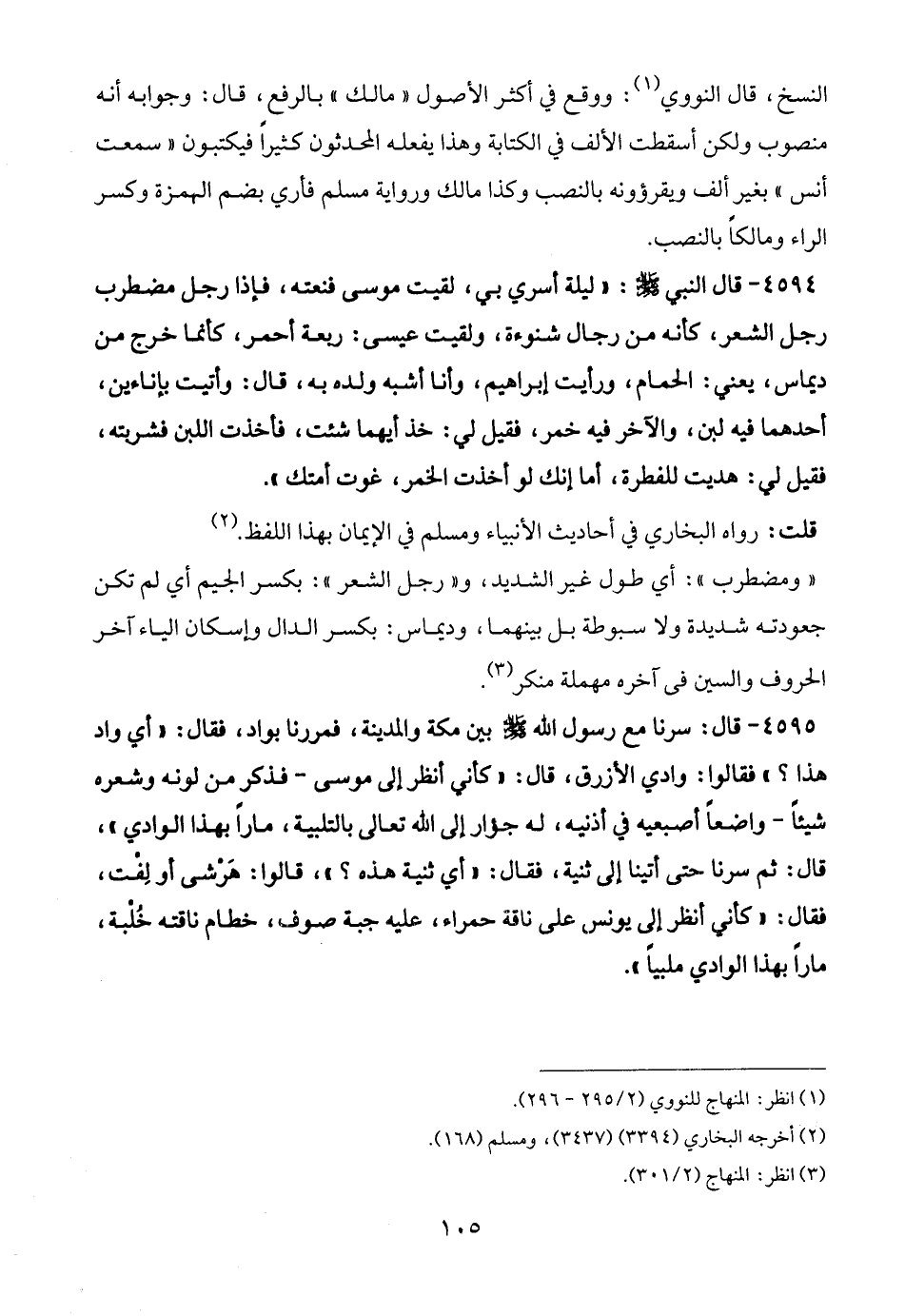 4595 - قال: سرنا مع رسول الله - صلى الله عليه وسلم - بين مكة والمدينة، فمررنا بواد، فقال: "أي واد هذا؟ " فقالوا: وادي الأزرق، قال: "كأني أنظر إلى موسى -فذكر من لونه وشعره شيئًا- واضعًا أصبعيه في أذنيه، له جؤار إلى الله تعالى بالتلبية، مارًّا بهذا الوادي"، قال: ثم سرنا حتى أتينا إلى ثنية، فقال: "أي ثنية هذه؟ "، قالوا: هَرْشى أو لِفْت، فقال: "كأني أنظر إلى يونس على ناقة حمراء، عليه جبة صوف، خطام ناقته خُلْبة، مارًّا بهذا الوادي ملبيًّا".