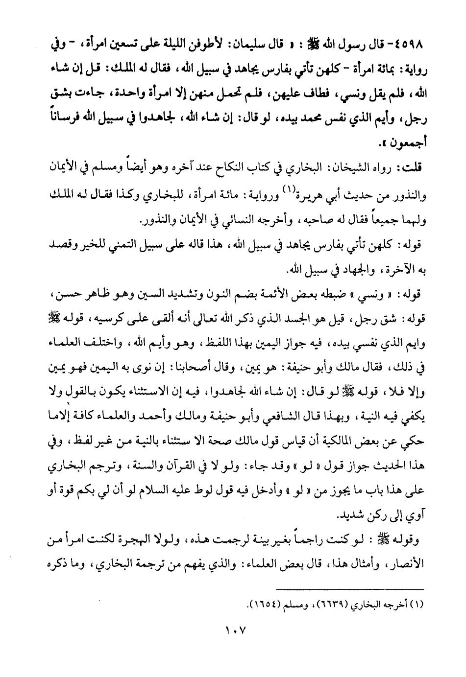 4598 - قال رسول الله - صلى الله عليه وسلم -: "قال سليمان: لأطوفن الليلة على تسعين امرأة، -وفي رواية: بمائة امرأة- كلهن تأتي بفارس يجاهد في سبيل الله، فقال له الملك: قل إن شاء الله، فلم يقل ونسي، فطاف عليهن، فلم تحمل منهن إلا امرأة واحدة، جاءت بشق رجل، وأيم الذي نفس محمد بيده، لو قال: إن شاء الله، لجاهدوا في سبيل الله فرسانًا أجمعون".
