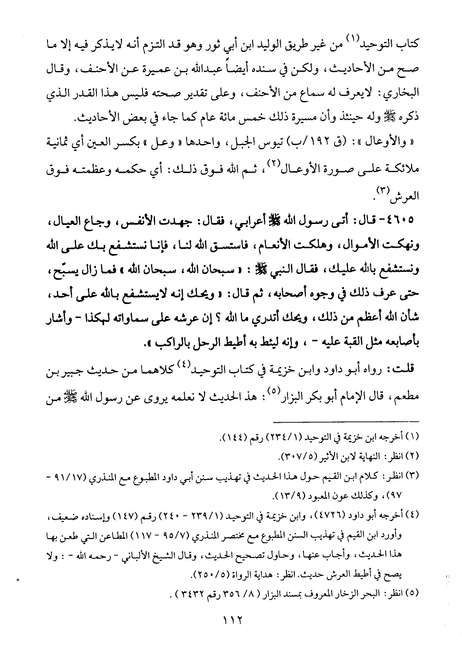 4605 - قال: أتى رسول الله - صلى الله عليه وسلم - أعرابي، فقال: جهدت الأنفس، وجاع العيال، ونهكت الأموال، وهلكت الأنعام، فاستسق الله لنا، فإنا نستشفع بك على الله ونستشفع بالله عليك، فقال النبي - صلى الله عليه وسلم -: "سبحان الله، سبحان الله" فما زال يسبّح، حتى عرف ذلك في وجوه أصحابه، ثم قال: "ويحك إنه لا يستشفع بالله على أحد، شأن الله أعظم من ذلك، ويحك أتدري ما الله؟ إن عرشه على سماواته لهكذا -وأشار بأصابعه مثل القبة عليه-، لأنه ليئط به أطيط الرحل بالراكب".