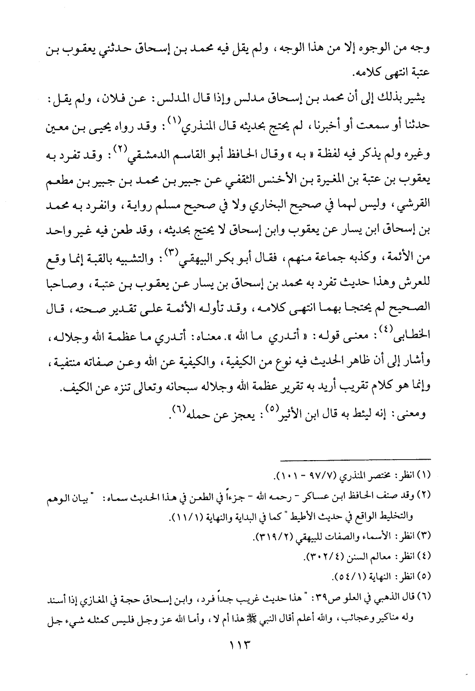 (¬6) قال الذهبي في العلو ص 39: "هذا حديث غريب جدًّا فرد، وابن إسحاق حجة في المغازي إذا أسند وله مناكير وعجائب، والله أعلم أقال النبي - صلى الله عليه وسلم - هذا أم لا، وأما الله عز وجل فليس كمثله شيء جل =