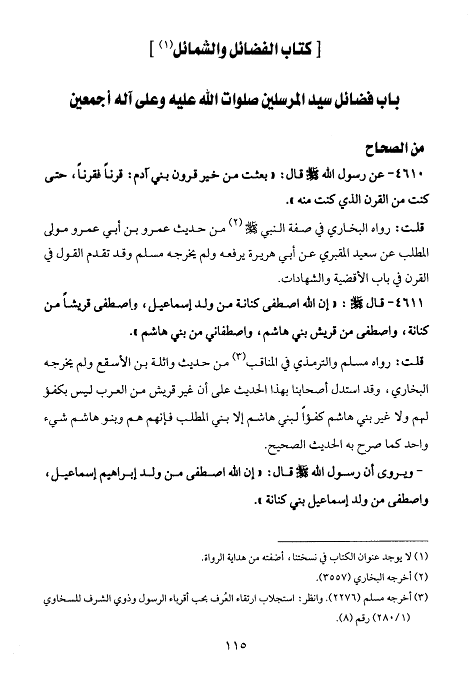 4611 - قال - صلى الله عليه وسلم -: "إن الله اصطفى كنانة من ولد إسماعيل، واصطفى قريشًا من كنانة، واصطفى من قريش بني هاشم، واصطفاني من بني هاشم".