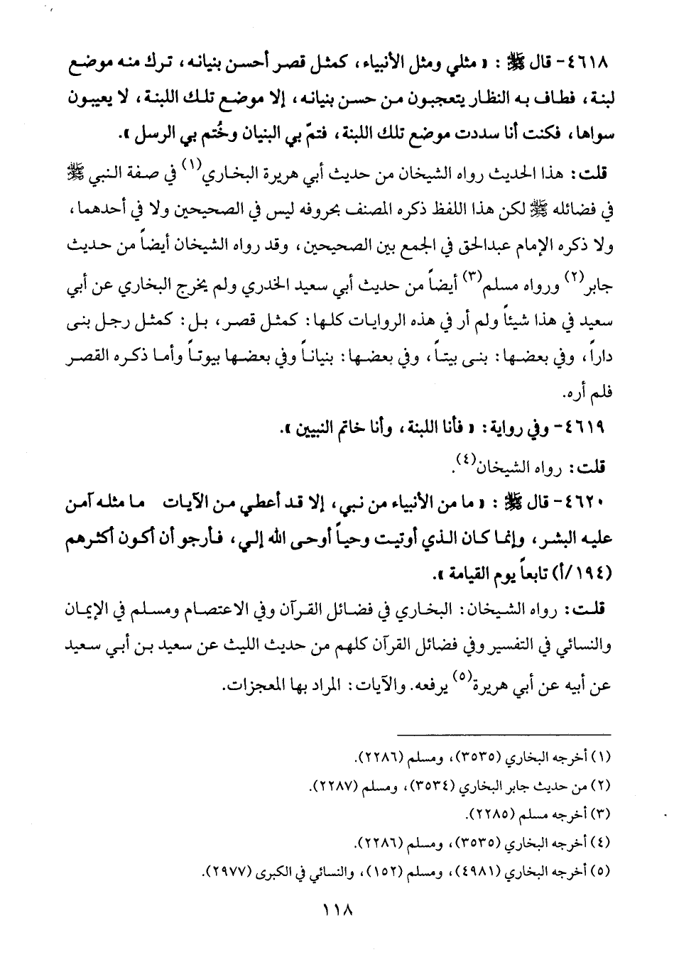 4618 - قال - صلى الله عليه وسلم -: "مثلي ومثل الأنبياء، كمثل قصر أحسن بنيانه، ترك منه موضع لبنة، فطاف به النظار يتعجبون من حسن بنيانه، إلا موضع تلك اللبنة، لا يعيبون سواها، فكنت أنا سددت موضع تلك اللبنة، فتمّ بي البنيان وخُتم بي الرسل".
