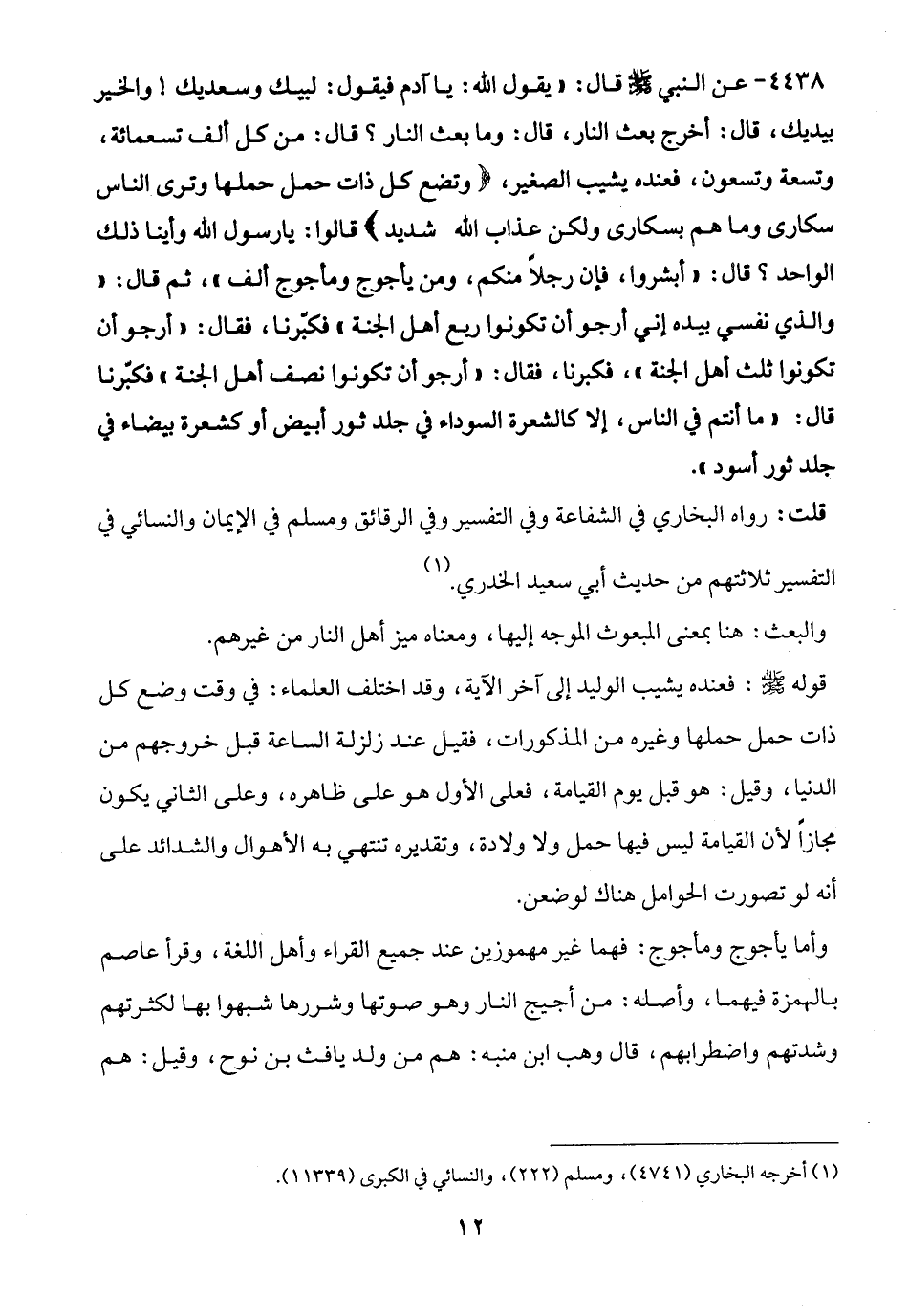 4438 - عن النبي - صلى الله عليه وسلم - قال: "يقول الله: يا آدم فيقول: لبيك وسعديك! والخير بيديك، قال: أخرج بعث النار، قال: وما بعث النار؟ قال: من كل ألف تسعمائة، وتسعة وتسعون، فعنده يشيب الصغير، {وتضع كل ذات حمل حملها وترى الناس سكارى وما هم بسكارى ولكن عذاب الله شديد} قالوا: يا رسول الله وأينا ذلك الواحد؟ قال: "أبشروا، فإن رجلًا منكم، ومن يأجوج ومأجوج ألف", ثم قال: "والذي نفسي بيده إني أرجو أن تكونوا ربع أهل الجنة" فكبّرنا، فقال: "أرجو أن تكونوا ثلث أهل الجنة"، فكبرنا، فقال: "أرجو أن تكونوا نصف أهل الجنة" فكبّرنا قال: "ما أنتم في الناس، إلا كالشعرة السوداء في جلد ثور أبيض أو كشعرة بيضاء في جلد ثور أسود".