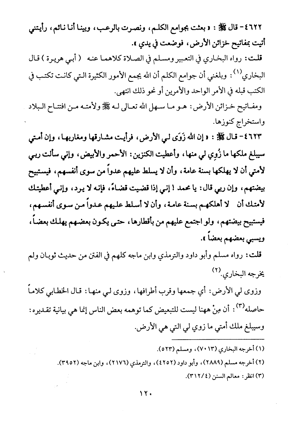 4622 - قال - صلى الله عليه وسلم -: "بعثت بجوامع الكلم، ونصرت بالرعب، وبينا أنا نائم، رأيتني أتيت بمفاتيح خزائن الأرض، فوضعت في يدي".