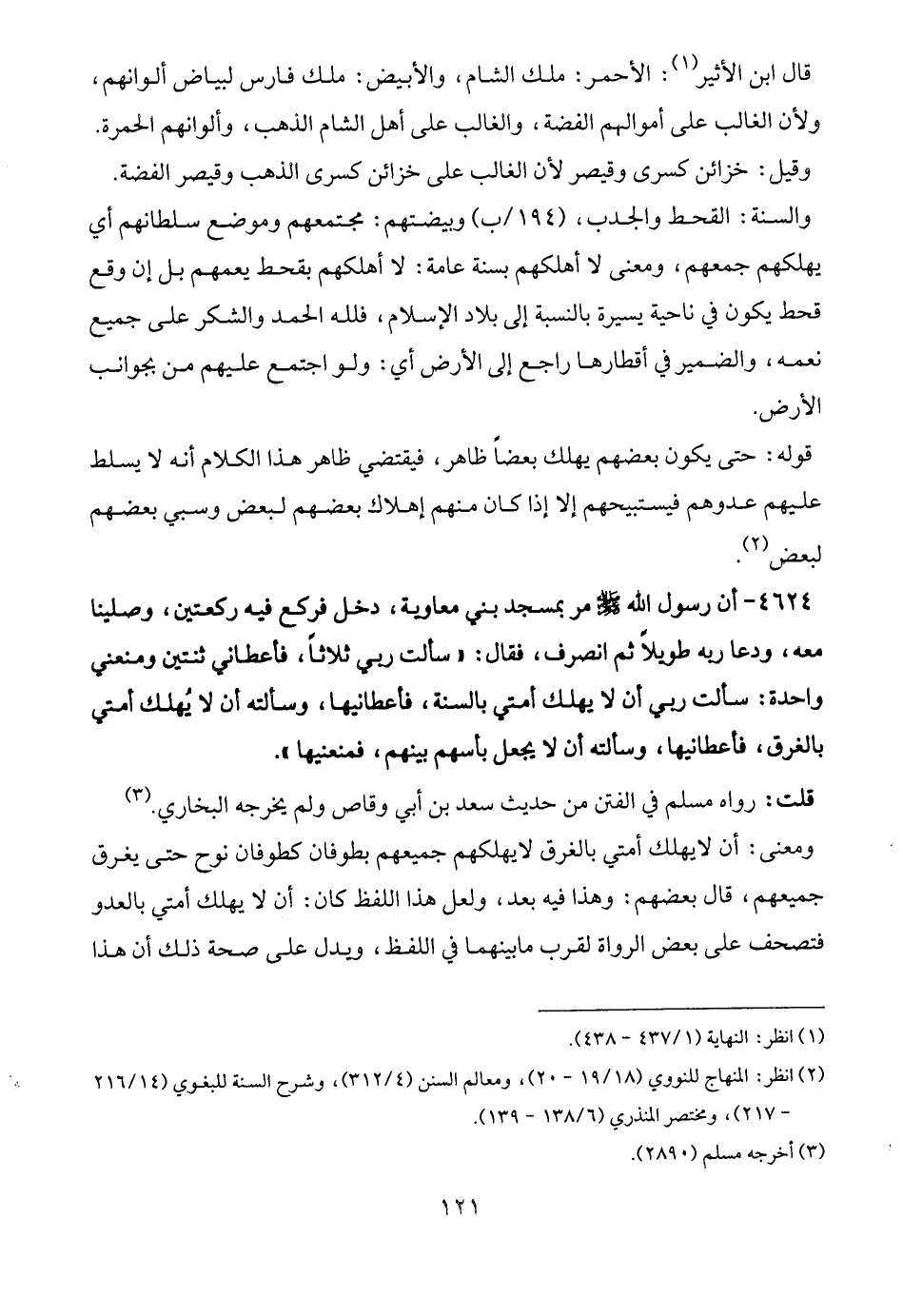 ومعنى: أن لا يهلك أمتي بالغرق لا يهلكهم جميعهم بطوفان كطوفان نوح حتى يغرق جميعهم، قال بعضهم: وهذا فيه بعد، ولعل هذا اللفظ كان: أن لا يهلك أمتي بالعدو فتصحف على بعض الرواة لقرب ما بينهما في اللفظ، ويدل على صحة ذلك أن هذا