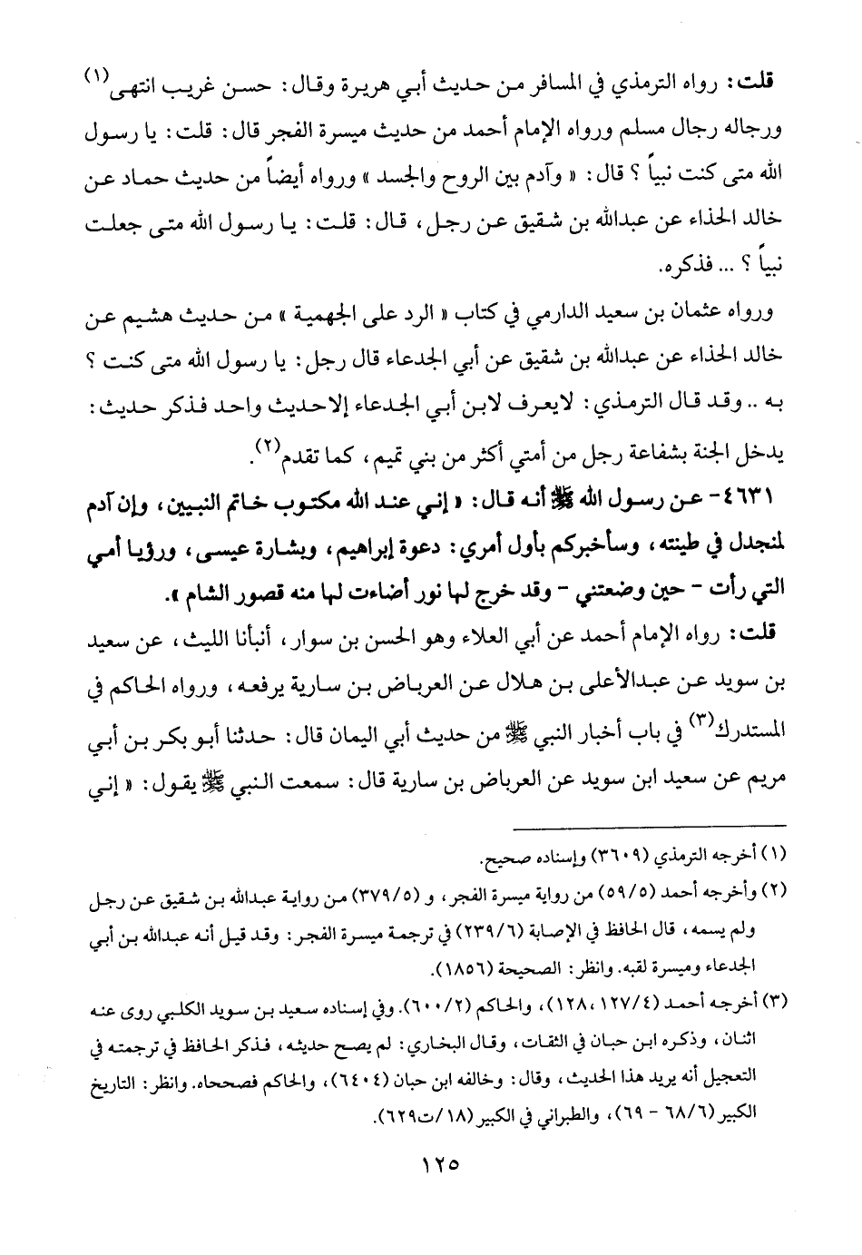 ورواه عثمان بن سعيد الدارمي في كتاب "الرد على الجهمية" من حديث هشيم عن خالد الحذاء عن عبد الله بن شقيق عن أبي الجدعاء قال رجل: يا رسول الله متى كنت؟ به .. وقد قال الترمذي: لا يعرف لابن أبي الجدعاء إلا حديث واحد فذكر حديث: يدخل الجنة بشفاعة رجل من أمتي أكثر من بني تميم، كما تقدم (¬2).