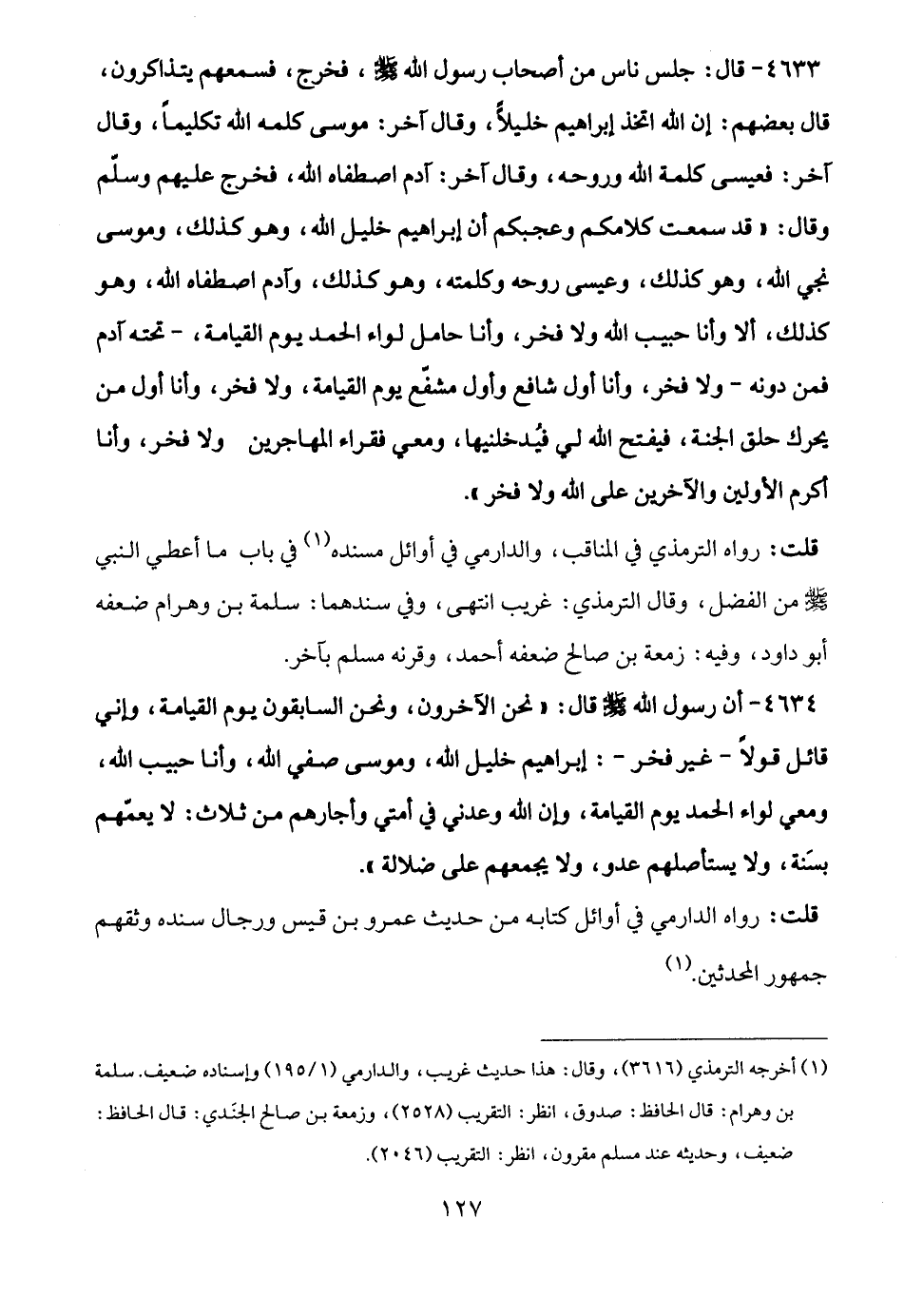 4633 - قال: جلس ناس من أصحاب رسول الله - صلى الله عليه وسلم -، فخرج، فسمعهم يتذاكرون، قال بعضهم: إن الله اتخذ إبراهيم خليلًا، وقال آخر: موسى كلمه الله تكليمًا، وقال آخر: فعيسى كلمة الله وروحه، وقال آخر: آدم اصطفاه الله، فخرج عليهم وسلّم وقال: "قد سمعت كلامكم وعجبكم أن إبراهيم خليل الله، وهو كذلك، وموسى نجي الله، وهو كذلك، وعيسى روحه وكلمته، وهو كذلك، وآدم اصطفاه الله، وهو كذلك، ألا وأنا حبيب الله ولا فخر، وأنا حامل لواء الحمد يوم القيامة، -تحته آدم فمن دونه- ولا فخر، وأنا أول شافع وأول مشفّع يوم القيامة، ولا فخر، وأنا أول من يحرك حلق الجنة، فيفتح الله لي فيُدخلنيها، ومعي فقراء المهاجرين ولا فخر، وأنا أكرم الأولين والآخرين على الله ولا فخر".