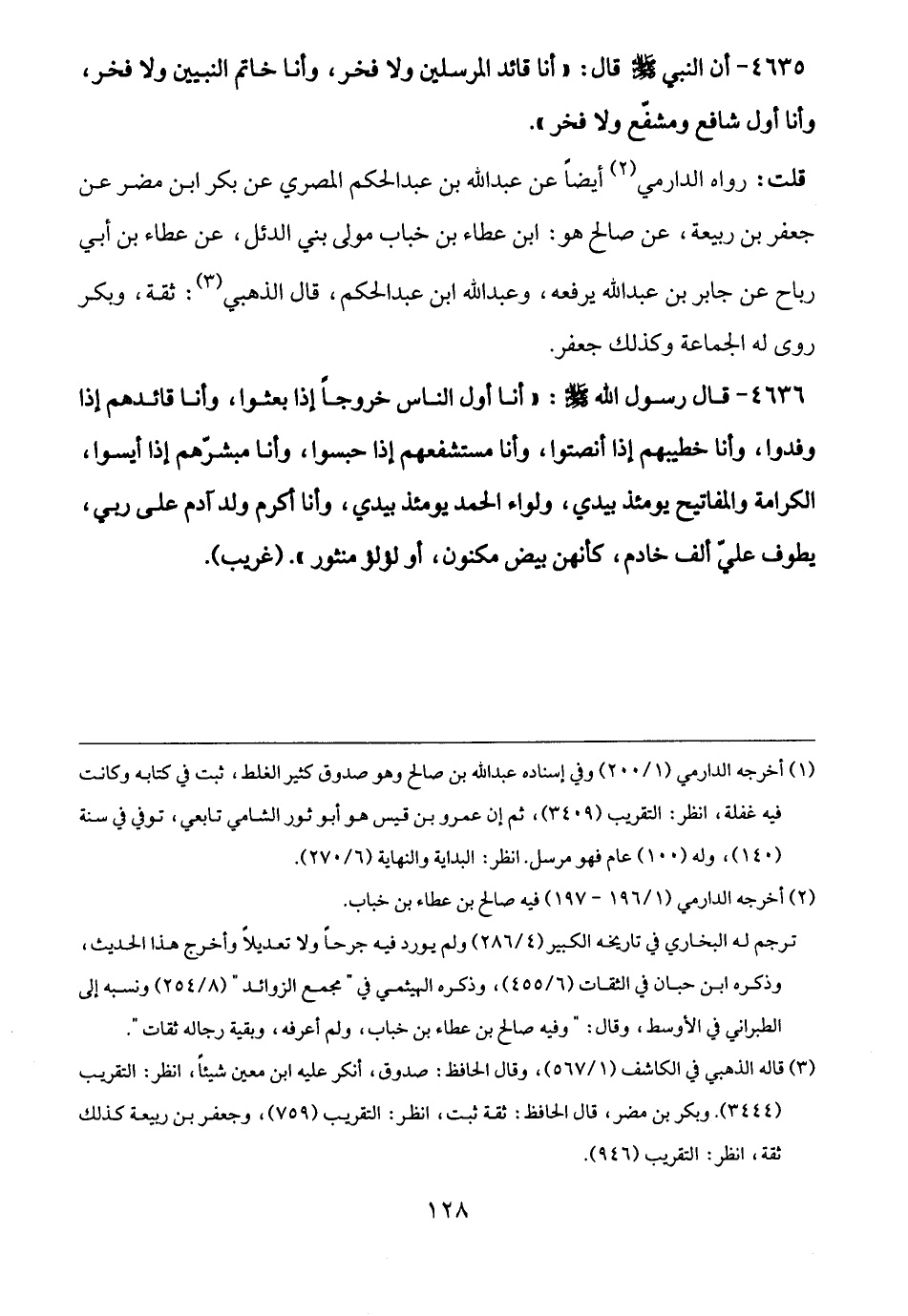 4635 - أن النبي - صلى الله عليه وسلم - قال: "أنا قائد المرسلين ولا فخر، وأنا خاتم النبيين ولا فخر، وأنا أول شافع ومشفّع ولا فخر".
