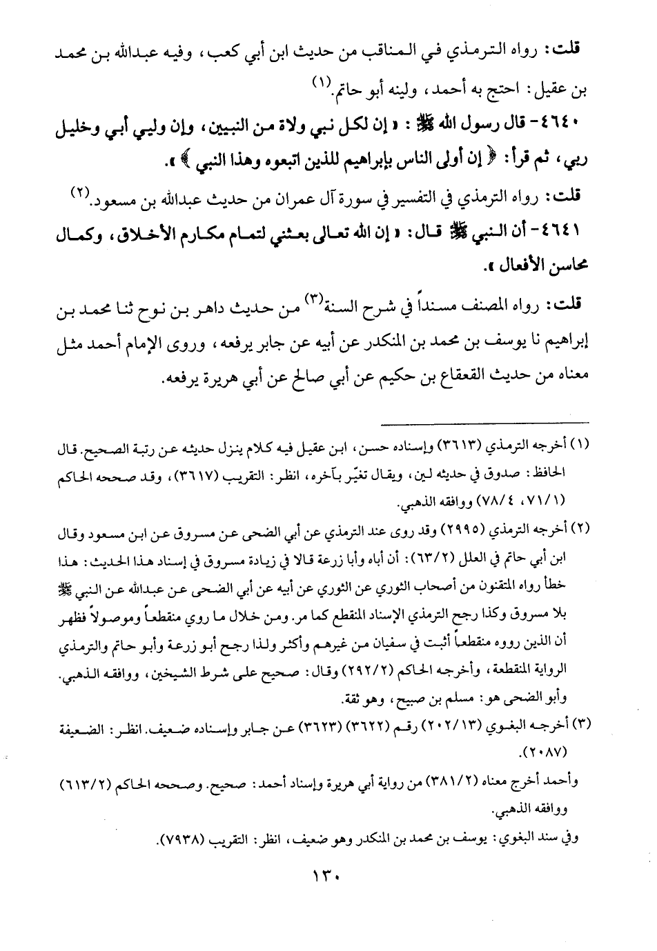 (¬2) أخرجه الترمذي (2995) وقد روى عند الترمذي عن أبي الضحى عن مسروق عن ابن مسعود وقال ابن أبي حاتم في العلل (2/ 63): أن أباه وأبا زرعة قالا في زيادة مسروق في إسناد هذا الحديث: هذا خطأ رواه المتقنون من أصحاب الثوري عن الثوري عن أبيه عن أبي الضحى عن عبد الله عن النبي - صلى الله عليه وسلم - بلا مسروق وكذا رجح الترمذي الإسناد المنقطع كما مر. ومن خلال ما روي منقطعًا وموصولًا فظهر أن الذين رووه منقطعًا أثبت في سفيان من غيرهم وأكثر ولذا رجح أبو زرعة وأبو حاتم والترمذي الرواية المنقطعة، وأخرجه الحاكم (2/ 292) وقال: صحيح على شرط الشيخين، ووافقه الذهبي. وأبو الضحى هو: مسلم بن صبيح، وهو ثقة.