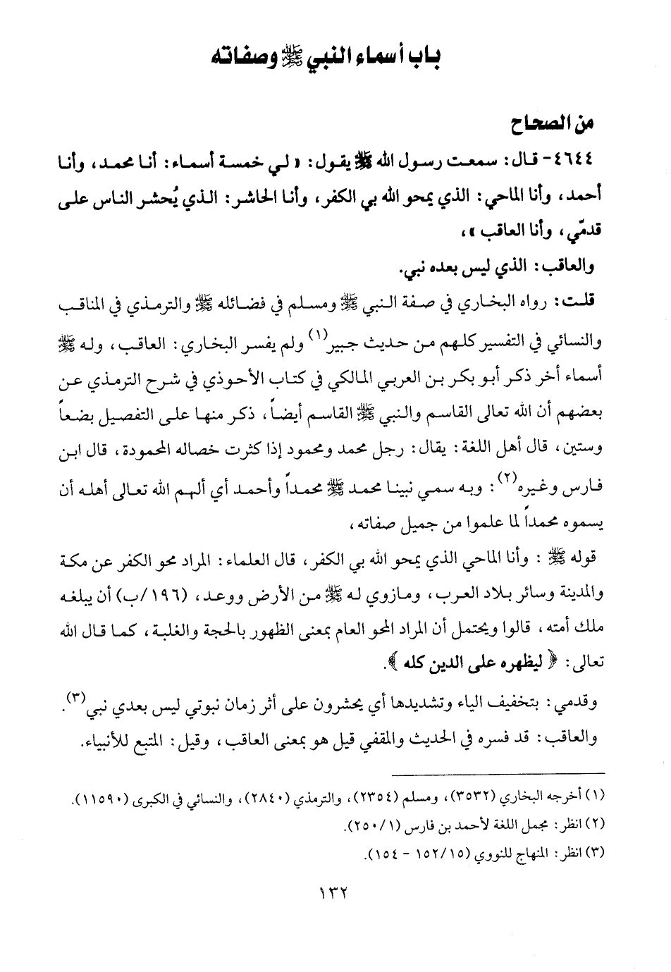 قلت: رواه البخاري في صفة النبي - صلى الله عليه وسلم - ومسلم في فضائله - صلى الله عليه وسلم - والترمذي في المناقب والنسائي في التفسير كلهم من حديث جبير (¬1) ولم يفسر البخاري: العاقب، وله - صلى الله عليه وسلم - أسماء أخر ذكر أبو بكر بن العربي المالكي في كتاب الأحوذي في شرح الترمذي عن بعضهم أن الله تعالى القاسم والنبي - صلى الله عليه وسلم - القاسم أيضًا، ذكر منها على التفصيل بضعًا وستين، قال أهل اللغة: يقال: رجل محمد ومحمود إذا كثرت خصاله المحمودة، قال ابن فارس وغيره (¬2): وبه سمي نبينا محمد - صلى الله عليه وسلم - محمدًا وأحمد أي ألهم الله تعالى أهله أن يسموه محمدًا لما علموا من جميل صفاته.
