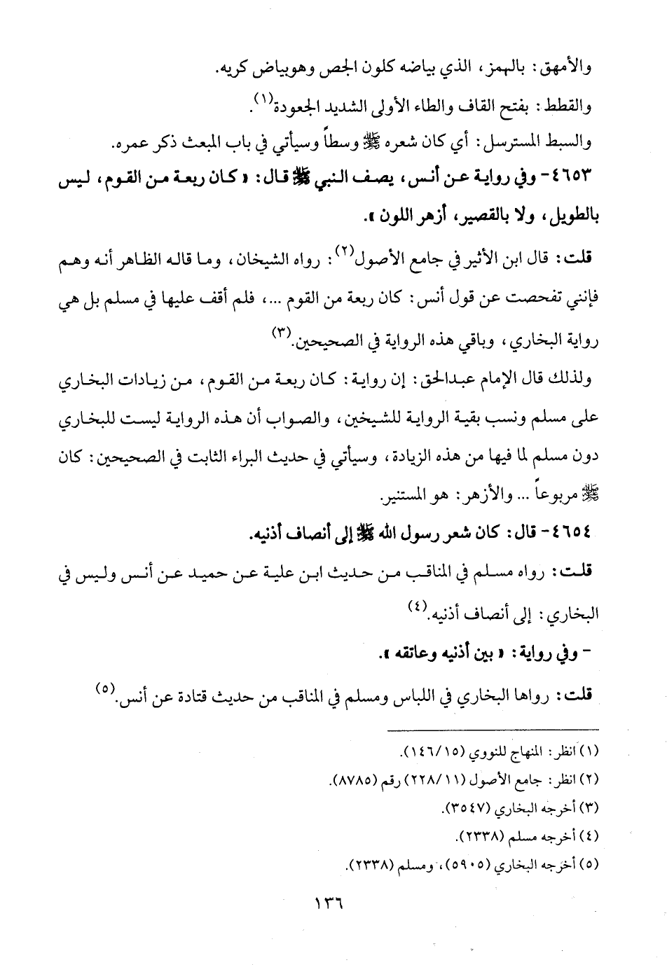 ولذلك قال الإمام عبد الحق: إن رواية: كان ربعة من القوم، من زيادات البخاري على مسلم ونسب بقية الرواية للشيخين، والصواب أن هذه الرواية ليست للبخاري دون مسلم لما فيها من هذه الزيادة، وسيأتي في حديث البراء الثابت في الصحيحين: كان - صلى الله عليه وسلم - مربوعًا ... والأزهر: هو المستنير.