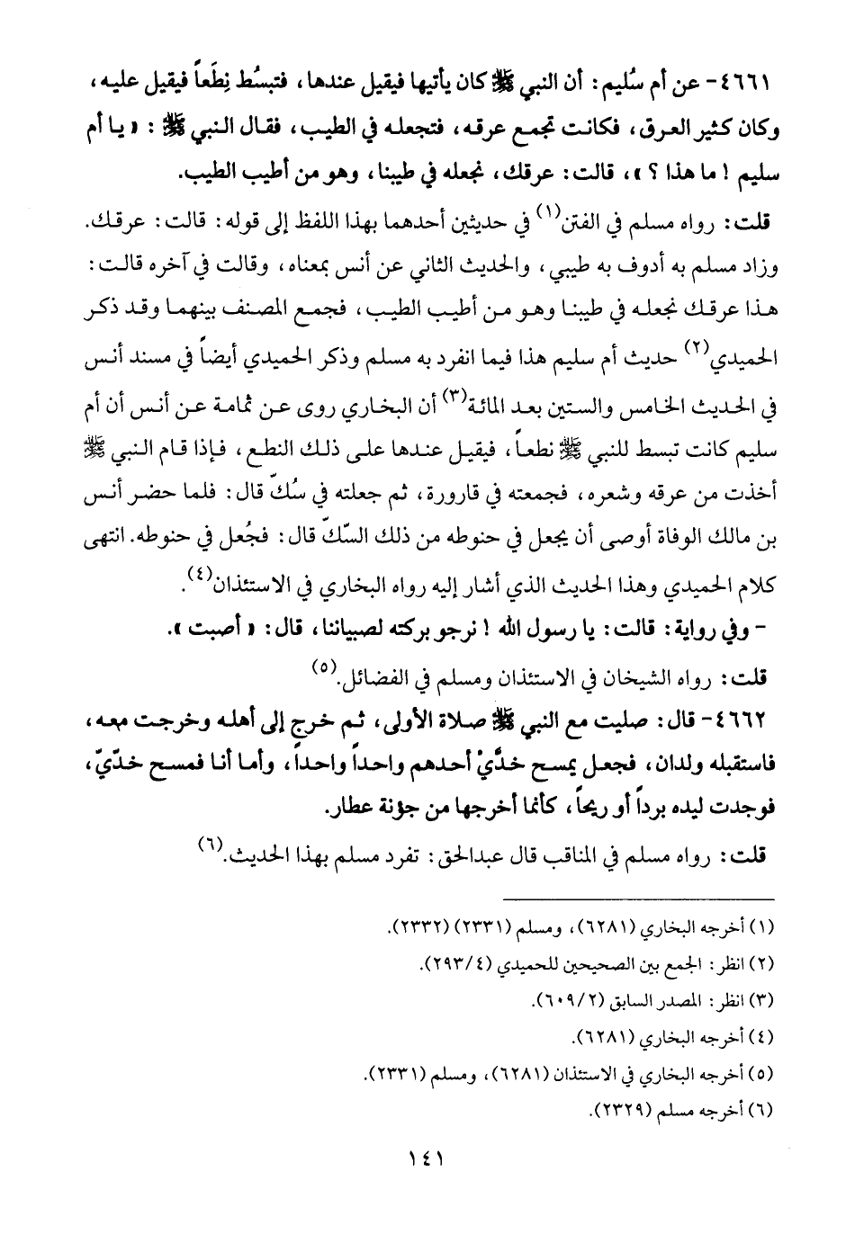 4661 - عن أم سُليم: أن النبي - صلى الله عليه وسلم - كان يأتيها فيقيل عندها، فتبسُط نِطَعًا فيقيل عليه، وكان كثير العرق، فكانت تجمع عرقه، فتجعله في الطيب، فقال النبي - صلى الله عليه وسلم -: "يا أم سليم! ما هذا؟ "، قالت: عرقك، نجعله في طيبنا، وهو من أطيب الطيب.