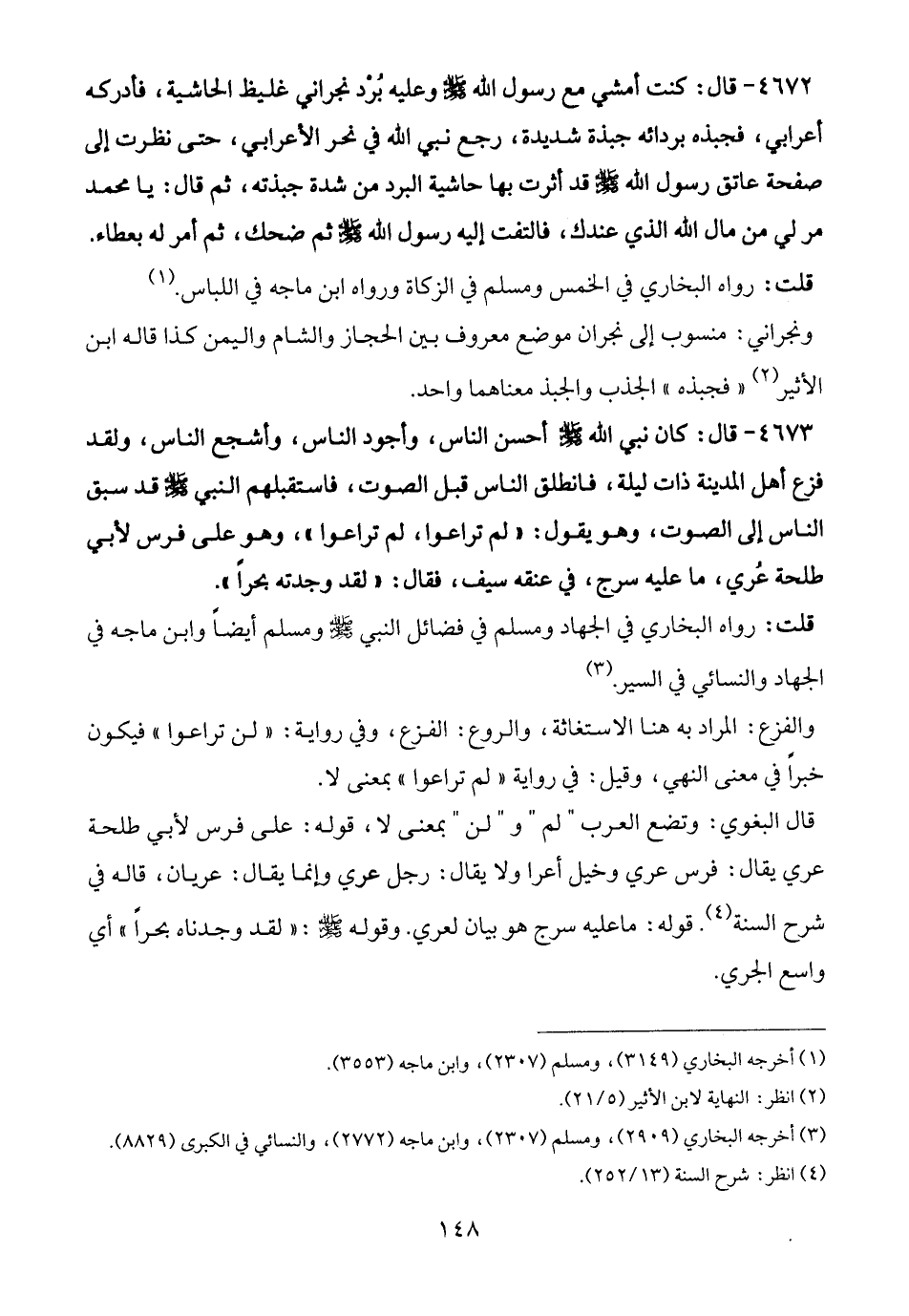 4672 - قال: كنت أمشي مع رسول الله - صلى الله عليه وسلم - وعليه بُرْد نجراني غليظ الحاشية، فأدركه أعرابي، فجبذه بردائه جبذة شديدة، رجع نبي الله في نحر الأعرابي، حتى نظرت إلى صفحة عاتق رسول الله - صلى الله عليه وسلم - قد أثرت بها حاشية البرد من شدة جبذته، ثم قال: يا محمد مر لي من مال الله الذي عندك، فالتفت إليه رسول الله - صلى الله عليه وسلم - ثم ضحك، ثم أمر له بعطاء.