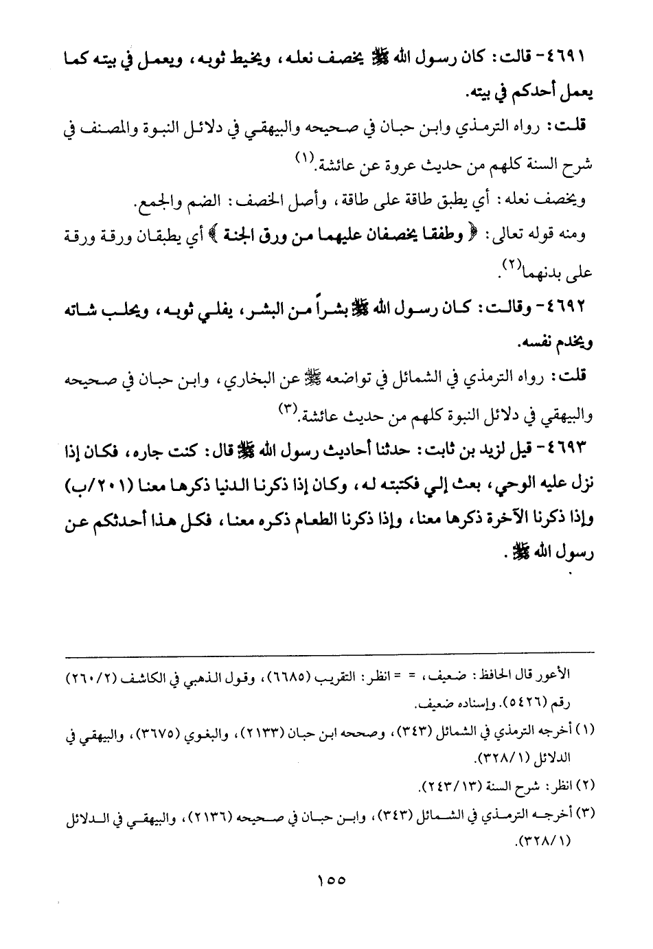 4691 - قالت: كان رسول الله - صلى الله عليه وسلم - يخصف نعله، ويخيط ثوبه، ويعمل في بيته كما يعمل أحدكم في بيته.