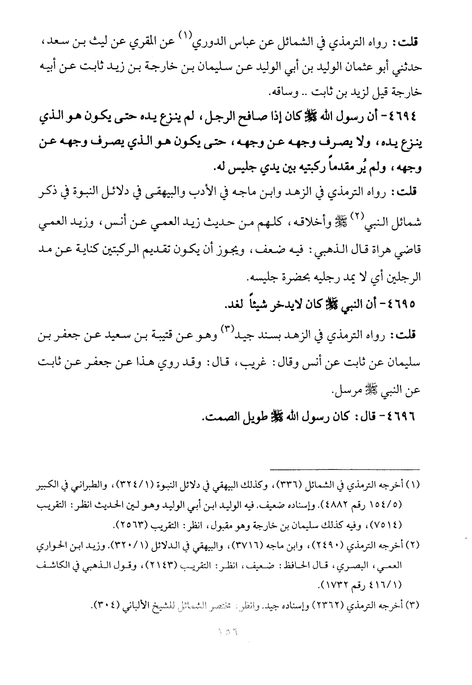 قلت: رواه الترمذي في الشمائل عن عباس الدوري (¬1) عن القري عن ليث بن سعد، حدثني أبو عثمان الوليد بن أبي الوليد عن سليمان بن خارجة بن زيد ثابت عن أبيه خارجة قيل لزيد بن ثابت .. وساقه.