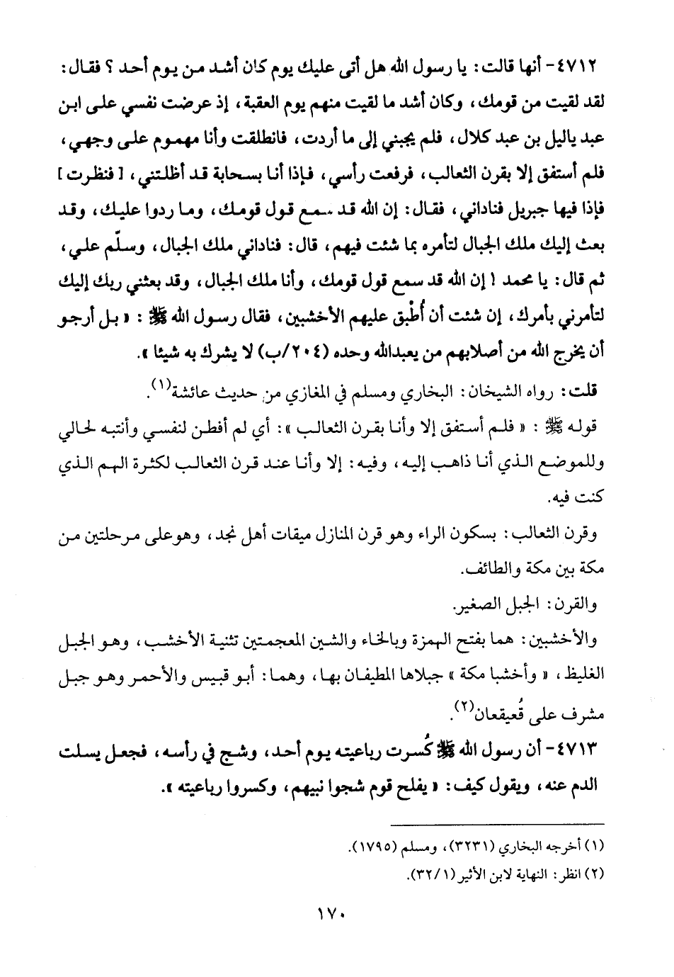 4712 - أنها قالت: يا رسول الله هل أتى عليك يوم كان أشد من يوم أحد؟ فقال: لقد لقيت من قومك، وكان أشد ما لقيت منهم يوم العقبة، إذ عرضت نفسي على ابن عبد ياليل بن عبد كلال، فلم يجبني إلى ما أردت، فانطلقت وأنا مهموم على وجهي، فلم أستفق إلا بقرن الثعالب، فرفعت رأسي، فإذا أنا بسحابة قد أظلتني، [فنظرت] فإذا فيها جبريل فناداني، فقال: إن الله قد سمع قول قومك، وما ردوا عليك، وقد بعث إليك ملك الجبال لتأمره بما شئت فيهم، قال: فناداني ملك الجبال، وسلّم علي، ثم قال: يا محمد! إن الله قد سمع قول قومك، وأنا ملك الجبال، وقد بعثني ربك إليك لتأمرني بأمرك، إن شئت أن أُطْبق عليهم الأخشبين، فقال رسول الله - صلى الله عليه وسلم -: "بل أرجو أن يخرج الله من أصلابهم من يعبد الله وحده لا يشرك به شيئا".