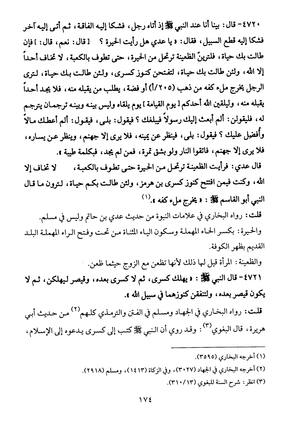 4720 - قال: بينا أنا عند النبي - صلى الله عليه وسلم - إذ أتاه رجل فشكا إليه الفاقة، ثم أتى إليه آخر فشكا إليه قطع السبيل، فقال: "يا عدي هل رأيت الحيرة؟ [قال: نعم، قال:] فإن طالت بك حياة، فلترينّ الظعينة ترتحل من الحيرة، حتى تطوف بالكعبة، لا تخاف أحدًا إلا الله، ولئن طالت بك حياة، لتفتحن كنوز كسرى، ولئن طالت بك حياة، لترى الرجل يخرج ملء كفه من ذهب أو فضة، يطلب من يقبله منه، فلا يجد أحدًا يقبله منه، وليلقين الله أحدكم [يوم القيامة] يوم يلقاه وليس بينه وبينه ترجمان يترجم له، فليقولن: ألم أبعث إليك رسولًا فيبلغك؟ فيقول: بلى، فيقول: ألم أعطك مالًا وأُفضِل عليك؟ فيقول: بلى، فينظر عن يمينه، فلا يرى إلا جهنم، وينظر عن يساره، فلا يرى إلا جهنم، فاتقوا النار ولو بشق تمرة، فمن لم يجد، فبكلمة طيبة".