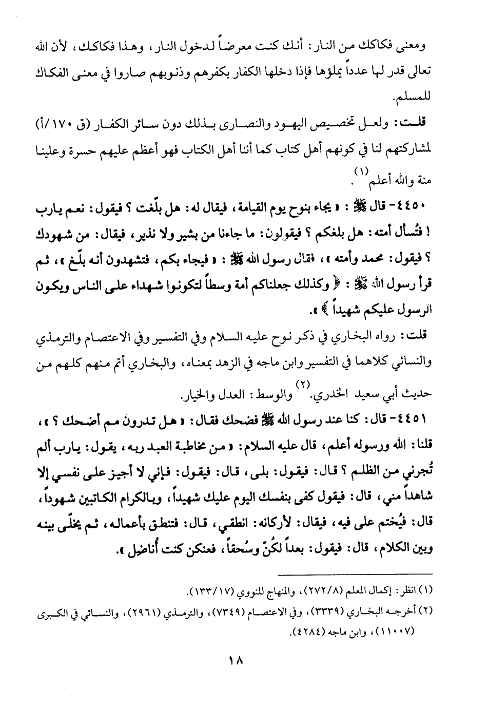قلت: رواه البخاري في ذكر نوح عليه السلام وفي التفسير وفي الاعتصام والترمذي والنسائي كلاهما في التفسير وابن ماجه في الزهد بمعناه، والبخاري أتم منهم كلهم من حديث أبي سعيد الخدري. (¬2) والوسط: العدل والخيار.