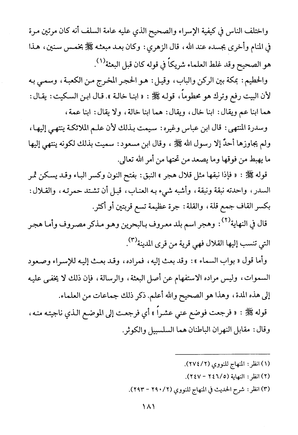 قوله - صلى الله عليه وسلم -: "فإذا نبقها مثل قلال هجر" النبق: بفتح النون وكسر الباء وقد يسكن ثمر السدر، واحدته نبقة ونبقة، وأشبه شيء به العناب، قبل أن تشتد حمرته، والقلال: بكسر القاف جمع قلة، والقلة: جرة عظيمة تسع قربتين أو أكثر.