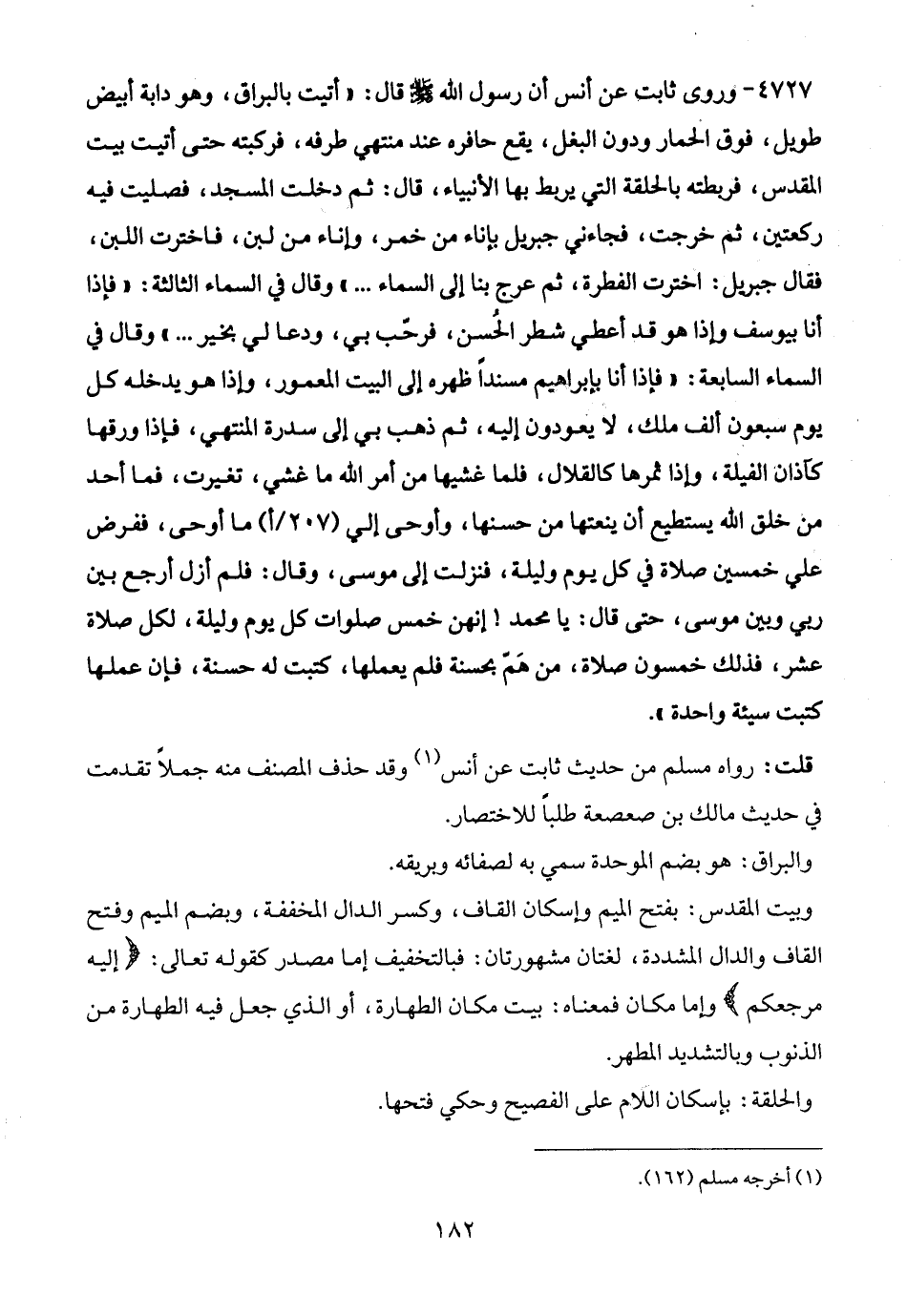 4727 - وروى ثابت عن أنس أن رسول الله - صلى الله عليه وسلم - قال: "أتيت بالبراق، وهو دابة أبيض طويل، فوق الحمار ودون البغل، يقع حافره عند منتهى طرفه، فركبته حتى أتيت بيت المقدس، فربطته بالحلقة التي يربط بها الأنبياء، قال: ثم دخلت المسجد، فصليت فيه ركعتين، ثم خرجت، فجاءني جبربل بإناء من خمر، وإناء من لبن، فاخترت اللبن، فقال جبريل: اخترت الفطرة، ثم عرج بنا إلى السماء ... " وقال في السماء الثالثة: "فإذا أنا بيوسف وإذا هو قد أعطي شطر الحُسن، فرحّب بي، ودعا لي بخير ... " وقال في السماء السابعة: "فإذا أنا بإبراهيم مسندًا ظهره إلى البيت المعمور، وإذا هو يدخله كل يوم سبعون ألف ملك، لا يعودون إليه، ثم ذهب بي إلى سدرة المنتهي، فإذا ورقها كآذان الفيلة، وإذا ثمرها كالقلال، فلما غشيها من أمر الله ما غشي، تغيرت، فما أحد من خلق الله يستطيع أن ينعتها من حسنها، وأوحى إلي ما أوحى، ففرض علي خمسين صلاة في كل يوم وليلة، فنزلت إلى موسى، وقال: فلم أزل أرجع بين ربي وبين موسى، حتى قال: يا محمد! إنهن خمس صلوات كل يوم وليلة، لكل صلاة عشر، فذلك خمسون صلاة، من هَمّ بحسنة فلم يعملها، كتبت له حسنة، فإن عملها كتبت سيئة واحدة".