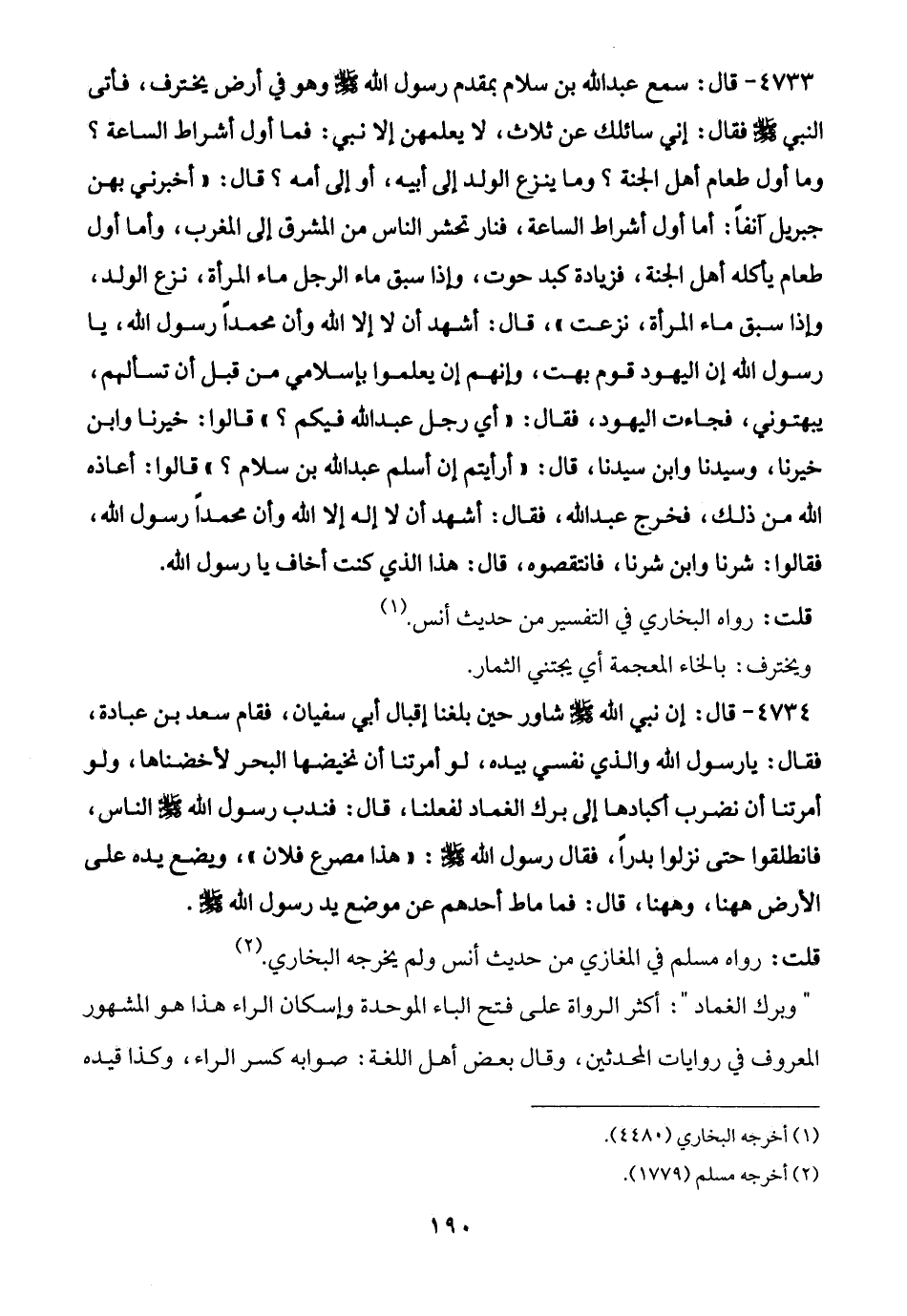 4733 - قال: سمع عبد الله بن سلام بمقدم رسول الله - صلى الله عليه وسلم - وهو في أرض يخترف، فأتى النبي - صلى الله عليه وسلم - فقال: إني سائلك عن ثلاث، لا يعلمهن إلا نبي: فما أول أشراط الساعة؟ وما أول طعام أهل الجنة؟ وما ينزع الولد إلى أبيه، أو إلى أمه؟ قال: "أخبرني بهن جبريل آنفًا: أما أول أشراط الساعة، فنار تحشر الناس من المشرق إلى المغرب، وأما أول طعام يأكه أهل الجنة، فزيادة كبد حوت، وإذا سبق ماء الرجل ماء المرأة، نزع الولد، وإذا سبق ماء المرأة، نزعت"، قال: أشهد أن لا إلا الله وأن محمدًا رسول الله، يا رسول الله إن اليهود قوم بهت، وإنهم إن يعلموا بإسلامي من قبل أن تسألهم، يبهتوني، فجاءت اليهود، فقال: "أي رجل عبد الله فيكم؟ "قالوا: خيرنا وابن خيرنا، وسيدنا وابن سيدنا، قال: "أرأيتم إن أسلم عبد الله بن سلام؟ " قالوا: أعاذه الله من ذلك، فخرج عبد الله، فقال: أشهد أن لا إله إلا الله وأن محمدًا رسول الله، فقالوا: شرنا وابن شرنا، فانتقصوه، قال: هذا الذي كنت أخاف يا رسول الله.