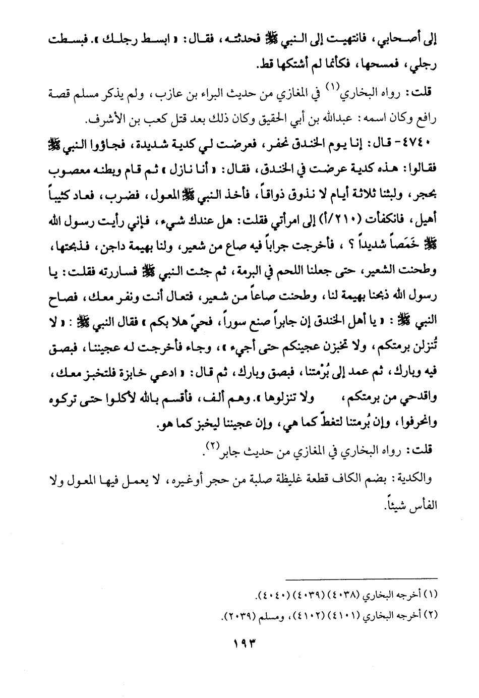 4740 - قال: إنا يوم الخندق نحفر، فعرضت لي كدية شديدة، فجاؤوا النبي - صلى الله عليه وسلم - فقالوا: هذه كدية عرضت في الخندق، فقال: "أنا نازل" ثم قام وبطنه معصوب بحجر، ولبثنا ثلاثة أيام لا نذوق ذواقًا، فأخذ النبي - صلى الله عليه وسلم - المعول، فضرب، فعاد كثيبًا أهيل، فانكفأت إلى امرأتي فقلت: هل عندك شيء، فإني رأيت رسول الله - صلى الله عليه وسلم - خَمَصًا شديدًا؟، فأخرجت جرابًا فيه صاع من شعير، ولنا بهيمة داجن، فذبحتها، وطحنت الشعير، حتى جعلنا اللحم في البرمة، ثم جئت النبي - صلى الله عليه وسلم - فساررته فقلت: يا رسول الله ذبحنا بهيمة لنا، وطحنت صاعًا من شعير، فتعال أنت ونفر معك، فصاح النبي - صلى الله عليه وسلم -: "يا أهل الخندق إن جابرًا صنع سورًا، فحيّ هلا بكم" فقال النبي - صلى الله عليه وسلم -: "لا تُنزلن برمتكم، ولا تخبزن عجينكم حتى أجيء"، وجاء فأخرجت له عجيننا، فبصق فيه وبارك، ثم عمد إلى بُرْمتنا، فبصق وبارك، ثم قال: "ادعي خابزة فلتخبز معك، واقدحي من برمتكم، ولا تنزلوها". وهم ألف، فأقسم بالله لأكلوا حتى تركوه وانحرفوا، وإنّ بُرمتنا لتغطّ كما هي، وإن عجيننا ليخبز كما هو.