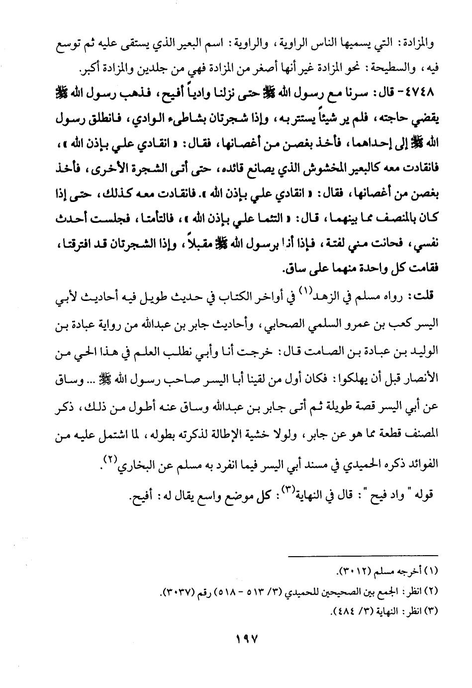 4748 - قال: سرنا مع رسول الله - صلى الله عليه وسلم - حتى نزلنا واديًا أفيح، فذهب رسول الله - صلى الله عليه وسلم - يقضي حاجته، فلم ير شيئًا يستتر به، وإذا شجرتان بشاطىء الوادي، فانطلق رسول الله - صلى الله عليه وسلم - إلى إحداهما، فأخذ بغصن من أغصانها، فقال: "انقادي علي بإذن الله"، فانقادت معه كالبعير المخشوش الذي يصانع قائده، حتى أتى الشجرة الأخرى، فأخذ بغصن من أغصانها، فقال: "انقادي علي بإذن الله". فانقادت معه كذلك، حتى إذا كان بالمنصف مما بينهما، قال: "التئما علي بإذن الله"، فالتأمتا، فجلست أحدث نفسي، فحانت مني لفتة، فإذا أنا برسول الله - صلى الله عليه وسلم - مقبلًا، وإذا الشجرتان قد افترقتا، فقامت كل واحدة منهما على ساق.