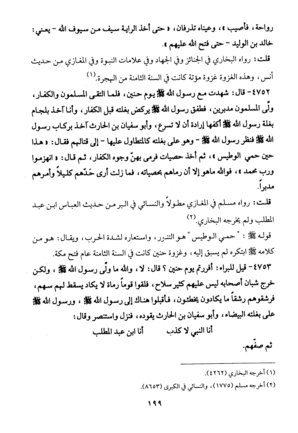 4753 - قيل للبراء: أفررتم يوم حنين؟ قال: لا، والله ما ولَّى رسول الله - صلى الله عليه وسلم -، ولكن خرج شبان أصحابه ليس عليهم كثير سلاح، فلقوا قومًا رماة لا يكاد يسقط لهم سهم، فرشقوهم رشقًا ما يكادون يخطئون، فأقبلوا هناك إلى رسول الله - صلى الله عليه وسلم -، ورسول الله - صلى الله عليه وسلم - على بغلته البيضاء، وأبو سفيان بن الحارث يقوده، فنزل واستنصر وقال: