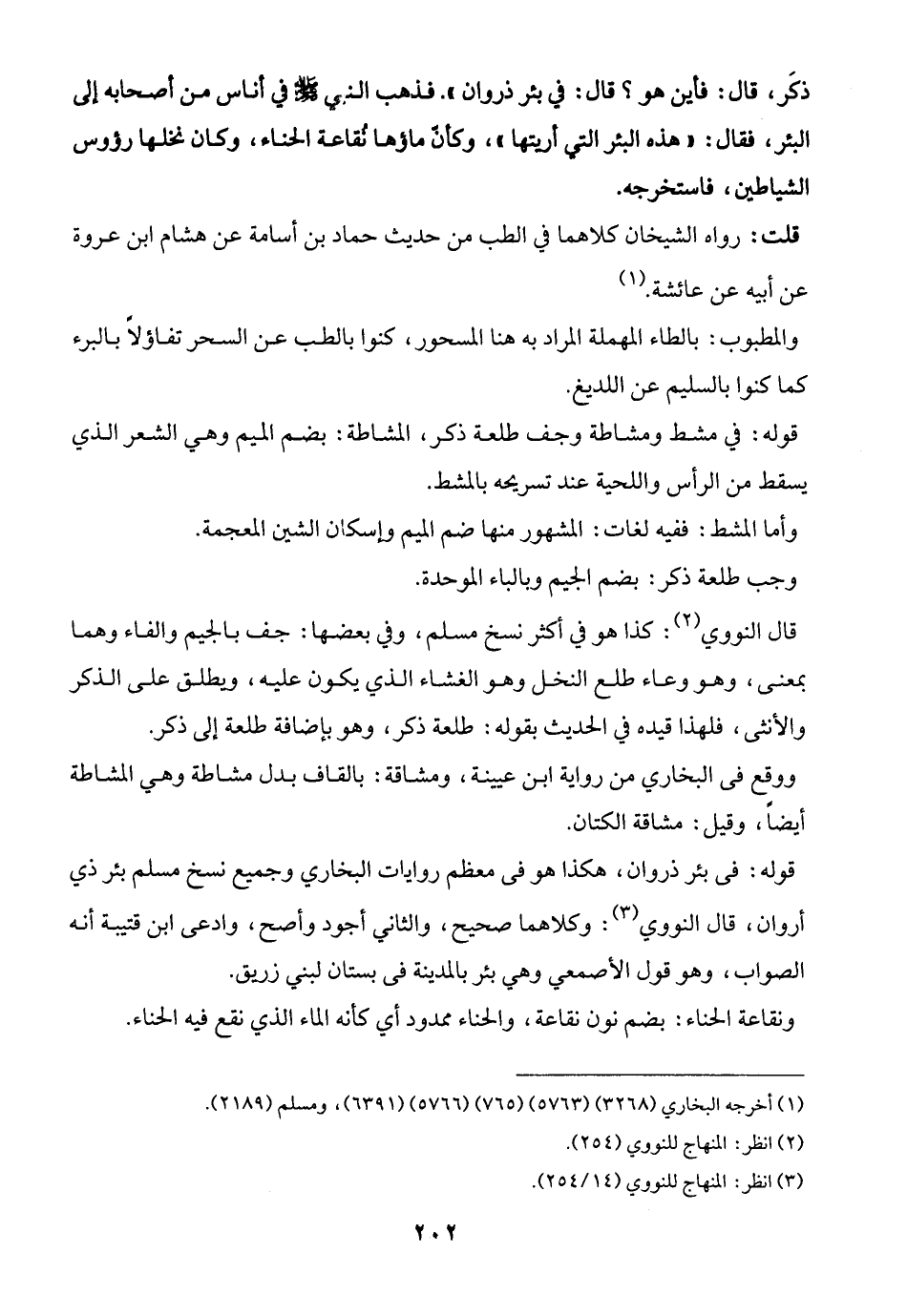 قوله: في بئر ذروان، هكذا هو في معظم روايات البخاري وجميع نسخ مسلم بئر ذي أروان، قال النووي (¬3): وكلاهما صحيح، والثاني أجود وأصح، وادعى ابن قتيبة أنه الصواب، وهو قول الأصمعي وهي بئر بالمدينة في بستان لبني زريق.