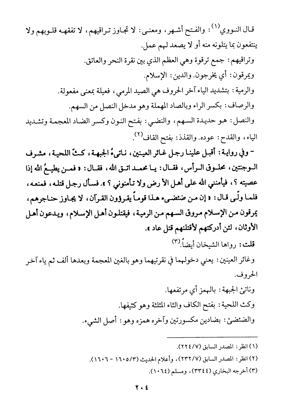 - وفي رواية: أقبل علينا رجل غائر العينين، ناتىءُ الجبهة، كثّ اللحية، مشرف الوجنتين، محلوق الرأس، فقال: يا محمد اتق الله، فقال: "فمن يطيعُ الله إذا عصيته؟، فيأمنني الله على أهل الأرض ولا تأمنوني؟ ". فسأل رجل قتله، فمنعه، فلما ولّى قال: "إن من ضئضىء هذا قومًا يقرؤون القرآن، لا يجاوز حناجرهم، يمرقون من الإسلام مروق السهم من الرمية، فيقتلون أهل الإسلام، ويدعون أهل الأوثان، لئن أدركتهم لأقتلنهم قتل عاد".