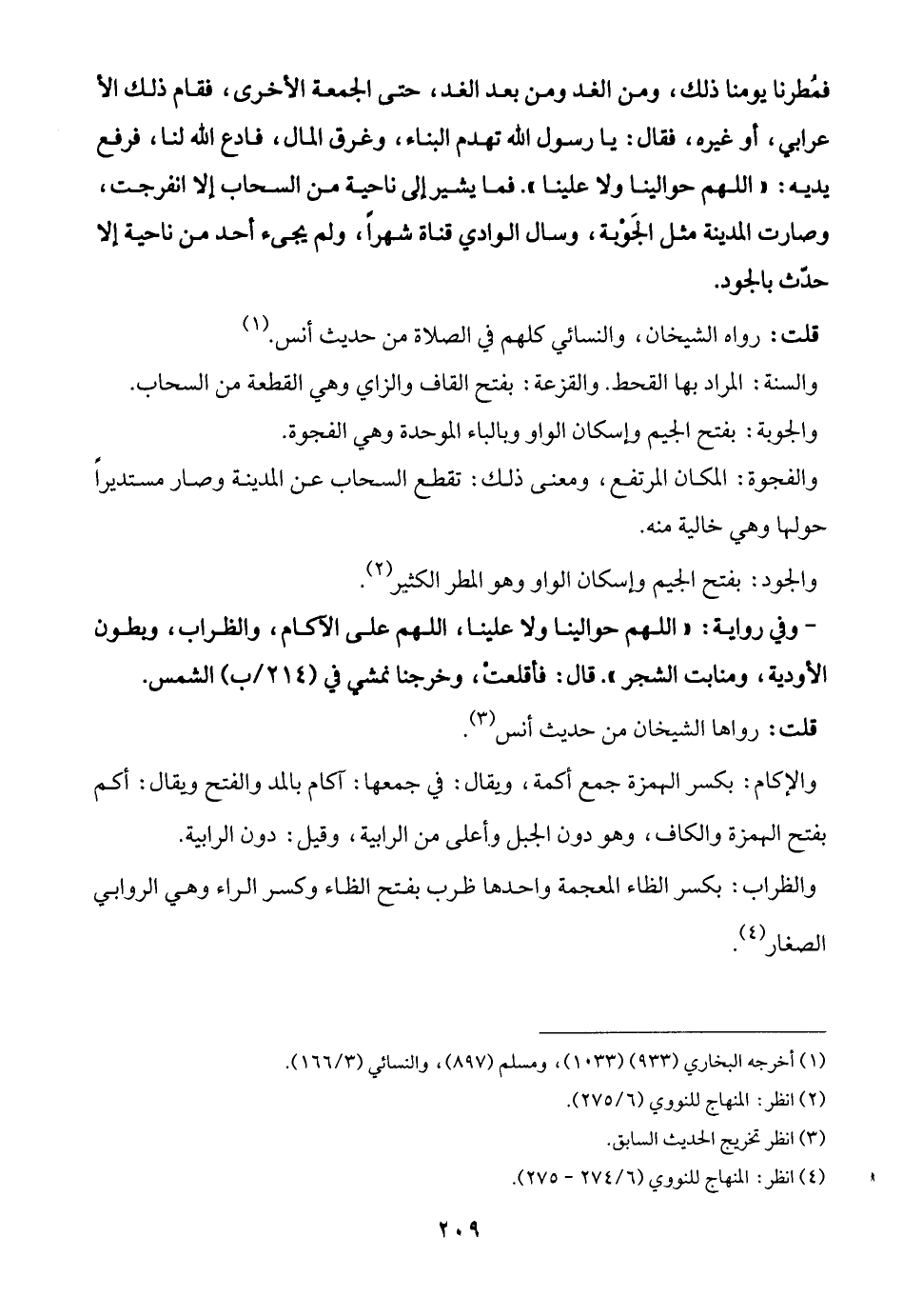 - وفي رواية: "اللهم حوالينا ولا علينا، اللهم على الآكام، والظراب، وبطون الأودية، ومنابت الشجر". قال: فأقلعت، وخرجنا نمشي في الشمس.