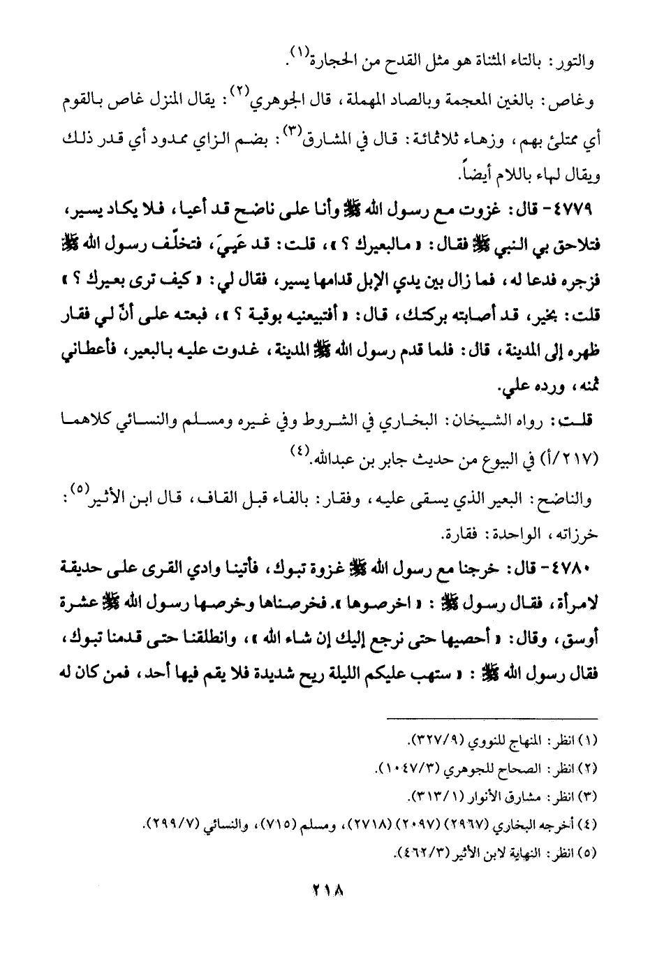 4779 - قال: غزوت مع رسول الله - صلى الله عليه وسلم - وأنا على ناضح قد أعيا، فلا يكاد يسير، فتلاحق بي النبي - صلى الله عليه وسلم - فقال: "ما لبعيرك؟ "، قلت: قد عَييَ، فتخلّف رسول الله - صلى الله عليه وسلم - فزجوه فدعا له، فما زال بين يدي الإبل قدامها يسير، فقال لي: "كيف ترى بعيرك؟ " قلت: بخير، قد أصابته بركتك، قال: "أفتبيعنيه بوقية؟ "، فبعته على أنّ لي فقار ظهره إلى المدينة، قال: فلما قدم رسول الله - صلى الله عليه وسلم - المدينة، غدوت عليه بالبعير، فأعطاني ثمنه، ورده علي.