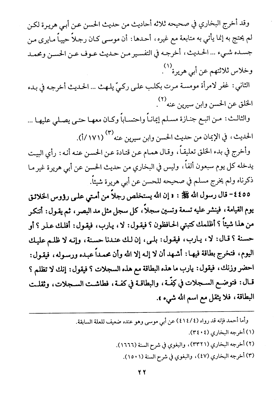 4455 - قال رسول الله - صلى الله عليه وسلم -: "إن الله يستخلص رجلًا من أمتي على رؤوس الخلائق يوم القيامة، فينشر عليه تسعة وتسعين سجلًا، كل سجل مثل مد البصر، ثم يقول: أتنكر من هذا شيئًا؟ أظلمك كتبتي الحافظون؟ فيقول: لا، يا رب، فيقول: أفلك عذر؟ أو حسنة؟ قال: لا، يا رب، فيقول: بلى، إن لك عندنا حسنة، وإنه لا ظلم عليك اليوم، فتخرج بطاقة فيها: أشهد أن لا إله إلا الله وأن محمدًا عبده ورسوله، فيقول: احضر وزنك، فيقول: يا رب ما هذه البطاقة مع هذه السجلات؟ فيقول: إنك لا تظلم؟ قال: فتوضع السجلات في كِفّة، والبطاقة في كفة، فطاشت السجلات، وثقلت البطاقة، فلا يثقل مع اسم الله شيء".