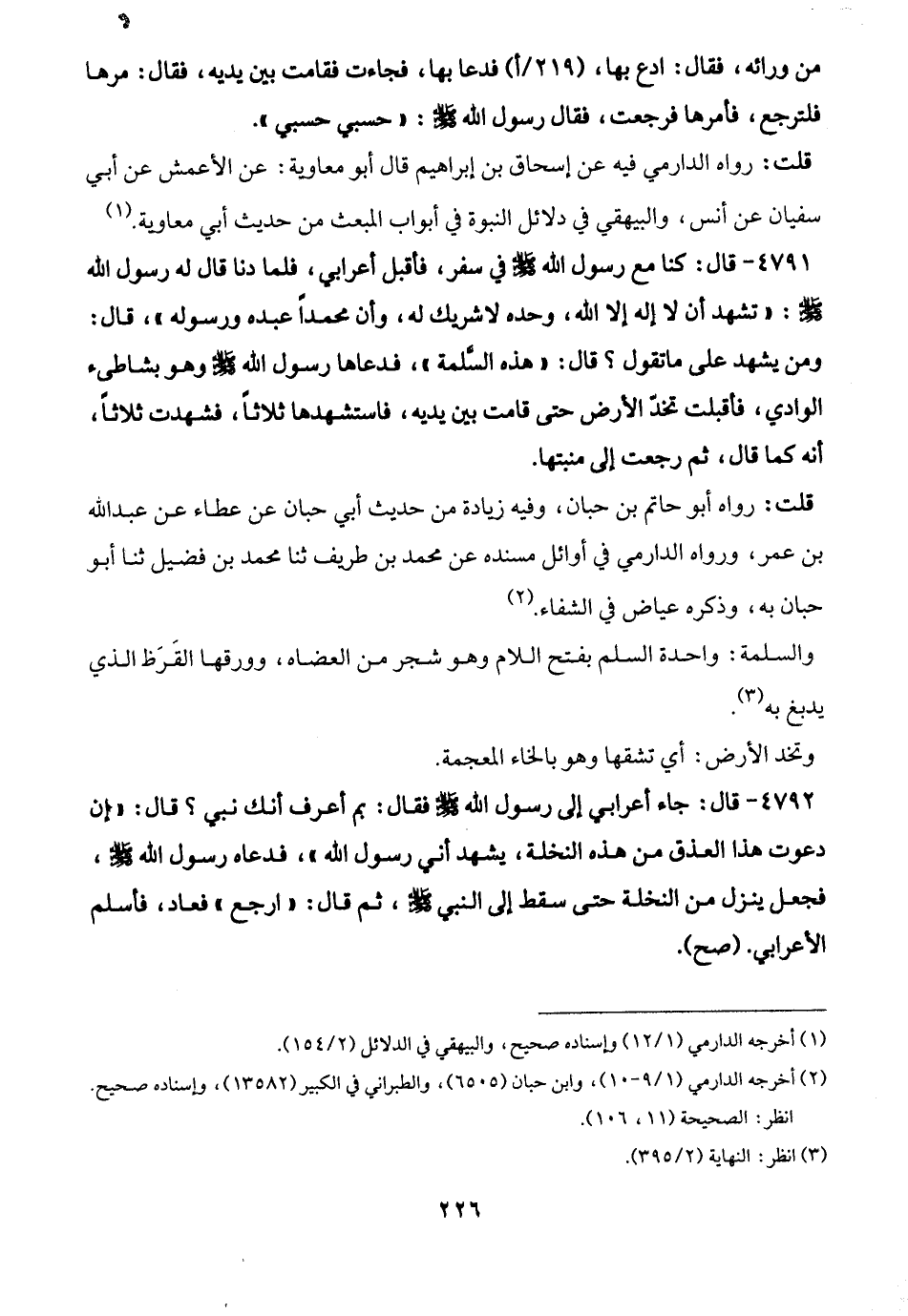 4791 - قال: كنا مع رسول الله -صلى الله عليه وسلم- في سفر، فأقبل أعرابي، فلما دنا قال له رسول الله - صلى الله عليه وسلم -: "تشهد أن لا إله إلا الله، وحده لا شريك له، وأن محمدًا عبده ورسوله"، قال: ومن يشهد على ما تقول؟ قال: "هذه السَّلمة"، فدعاها رسول الله -صلى الله عليه وسلم- وهو بشاطىء الوادي، فأقبلت تخدّ الأرض حتى قامت بين يديه، فاستشهدها ثلاثًا، فشهدت ثلاثًا، أنه كما قال، ثم رجعت إلى منبتها.