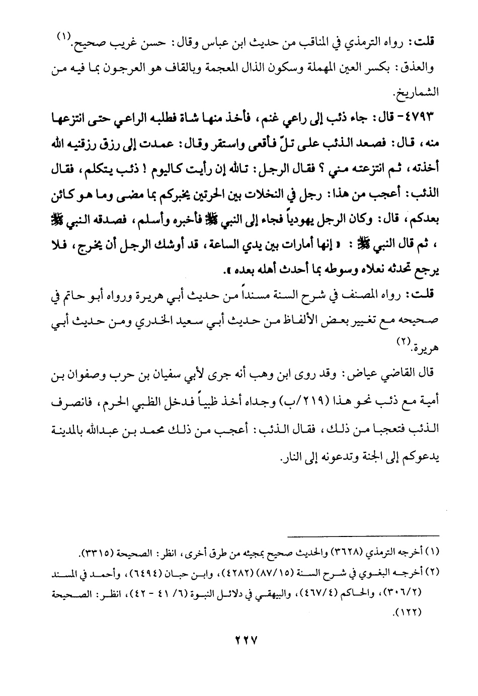 4793 - قال: جاء ذئب إلى راعي غنم، فأخذ منها شاة فطلبه الراعي حتى انتزعها منه، قال: فصعد الذئب على تلّ فأقعى واستقر وقال: عمدت إلى رزق رزقنيه الله أخذته، ثم انتزعته مني؟ فقال الرجل: تالله إن رأيت كاليوم! ذئب يتكلم، فقال الذئب: أعجب من هذا: رجل في النخلات بين الحرتين يخبركم بما مضى وما هو كائن بعدكم، قال: وكان الرجل يهوديًّا فجاء إلى النبي -صلى الله عليه وسلم- فأخبره وأسلم، فصدقه النبي -صلى الله عليه وسلم-، ثم قال النبي -صلى الله عليه وسلم-: "إنها أمارات بين يدي الساعة، قد أوشك الرجل أن يخرج، فلا يرجع تحدثه نعلاه وسوطه بما أحدث أهله بعده".