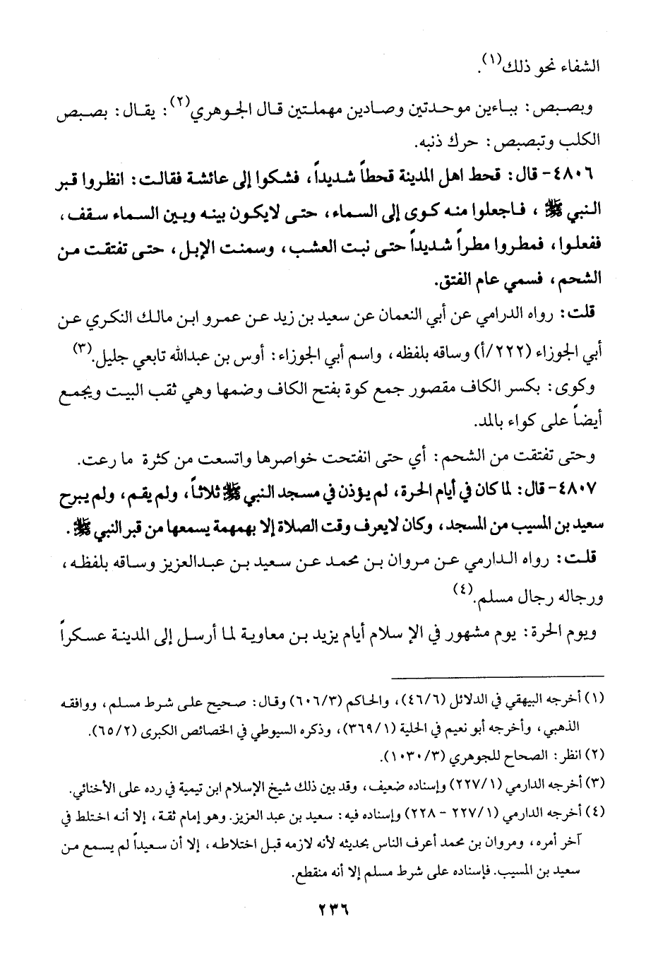 4806 - قال: قحط أهل المدينة قحطًا شديدًا، فشكوا إلى عائشة فقالت: انظروا قبر النبي -صلى الله عليه وسلم-، فاجعلوا منه كوى إلى السماء، حتى لا يكون بينه وبين السماء سقف، ففعلوا، فمطروا مطرًا شديدًا حتى نبت العشب، وسمنت الإبل، حتى تفتقت من الشحم، فسمي عام الفتق.