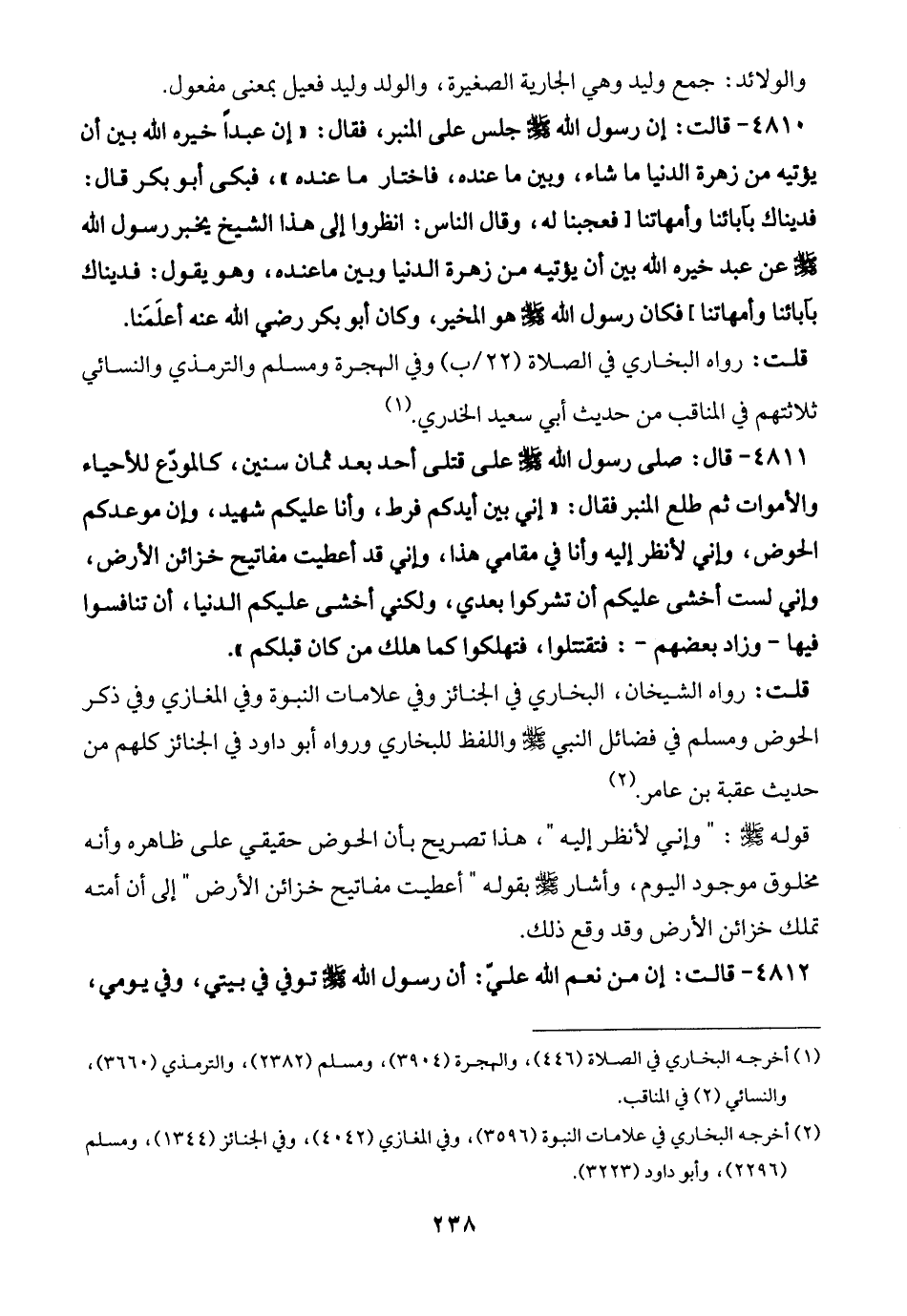 قلت: رواه الشيخان، البخاري في الجنائز وفي علامات النبوة وفي المغازي وفي ذكر الحوض ومسلم في فضائل النبي -صلى الله عليه وسلم- واللفظ للبخاري ورواه أبو داود في الجنائز كلهم من حديث عقبة بن عامر. (¬2)