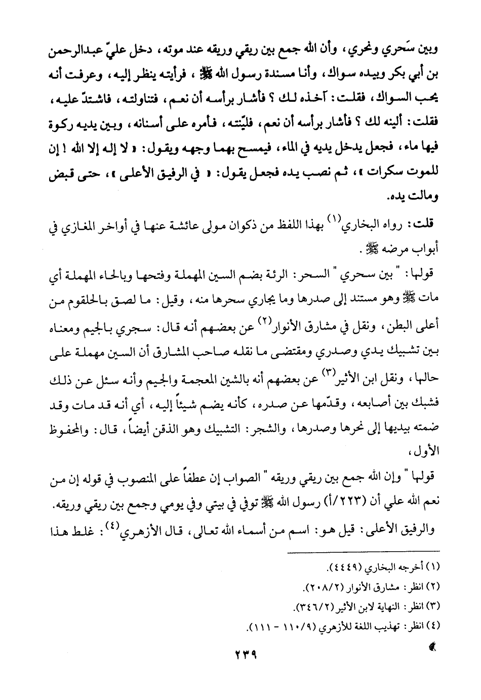 وبين سَحري ونحري، وأن الله جمع بين ريقي وريقه عند موته، دخل عليّ عبد الرحمن بن أبي بكر وبيده سواك، وأنا مسندة رسول الله -صلى الله عليه وسلم-، فرأيته ينظر إليه، وعرفت أنه يحب السواك، فقلت: آخذه لك؟ فأشار برأسه أن نعم، فتناولته، فاشتدّ عليه، فقلت: ألينه لك؟ فأشار برأسه أن نعم، فليّنته، فأمره على أسنانه، وبين يديه ركوة فيها ماء، فجعل يدخل يديه في الماء، فيمسح بهما وجهه ويقول: "لا إله إلا الله! إن للموت سكرات"، ثم نصب يده فجعل يقول: "في الرفيق الأعلى"، حتى قبض ومالت يده.